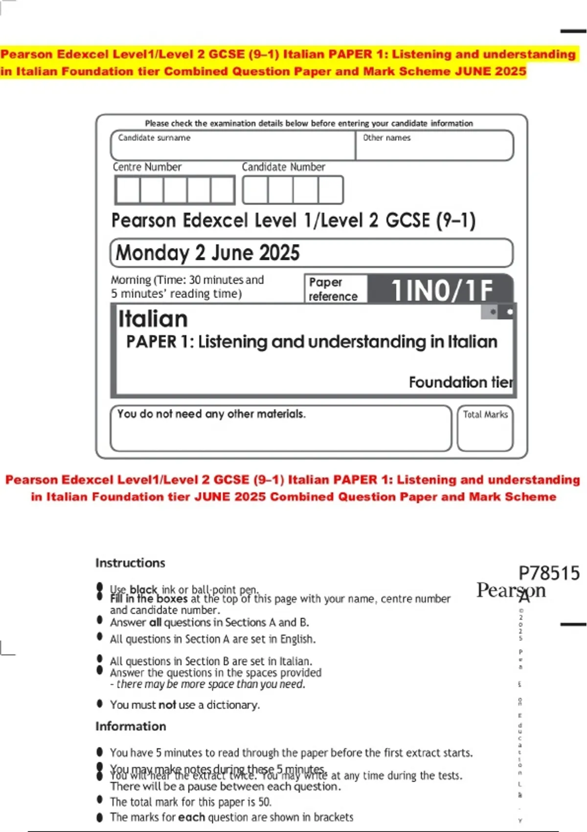 Pearson Edexcel Level1/Level 2 GCSE (9–1) Italian PAPER 1: Listening and understanding in Italian Higher tier Combined Question Paper and Mark Scheme JUNE 2025