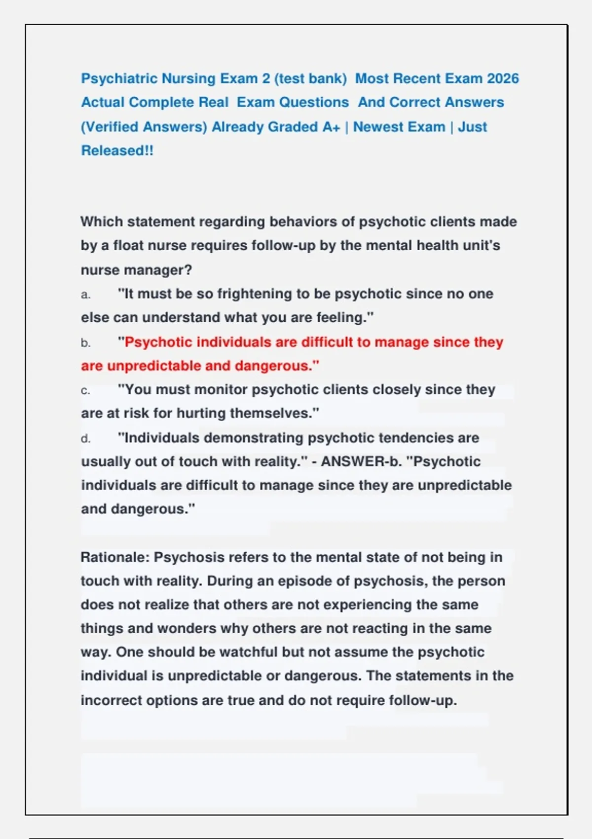 Psychiatric Nursing Exam 2 (test bank) Most Recent Exam 2026 Actual Complete Real Exam Questions And Correct Answers (Verified Answers) Already Graded A+ | Newest Exam | Just Released!! Psychiatric Nursing Exam Two | Most Recent Exam 2026 Actual Complete Real Exam Questions And Correct Answers (Verified Answers) Already Graded A+ | Newest Exam