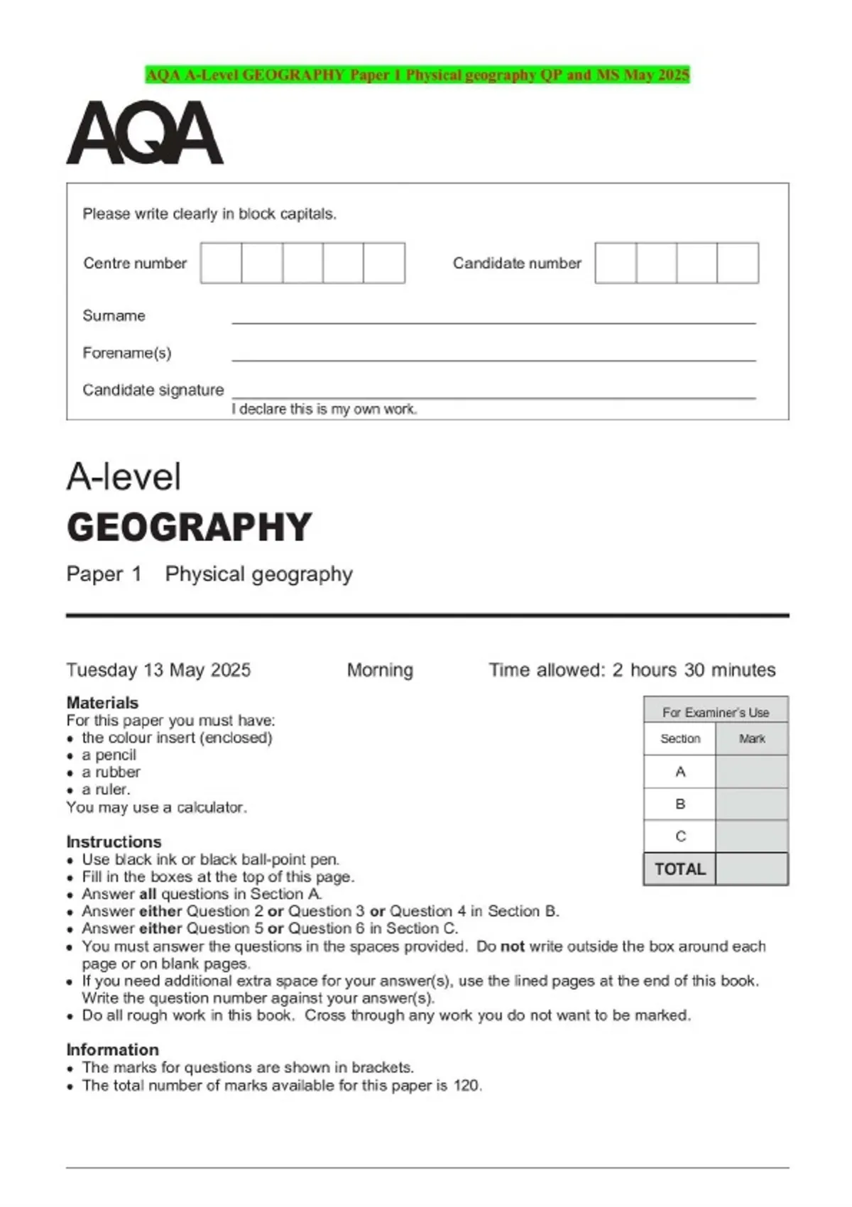 BUNDLE:::AQA A-LEVEL GEOGRAPHY 2025 Combined Question Paper and Mark Scheme