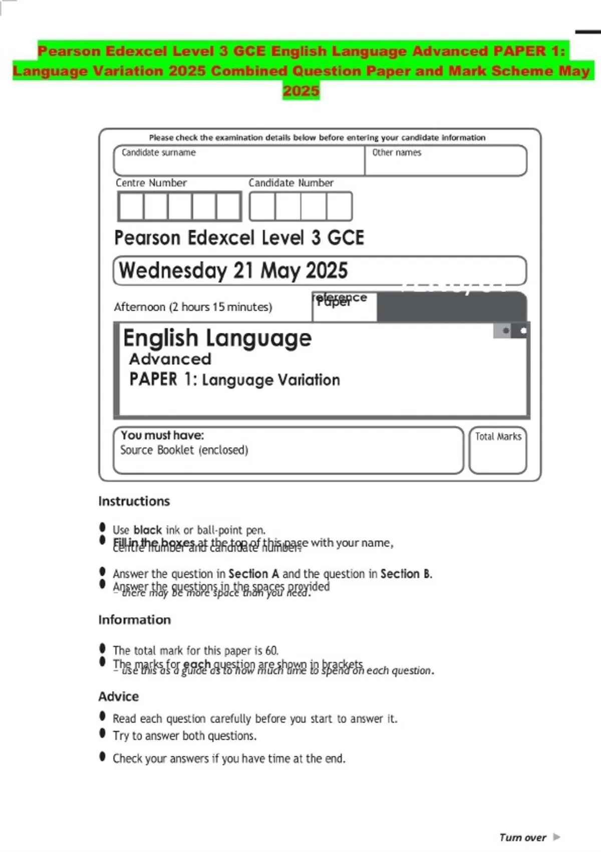 Pearson Edexcel Level 3 GCE English Language Advanced PAPER 1: Language Variation 2025 Combined Question Paper and Mark Scheme May 2025