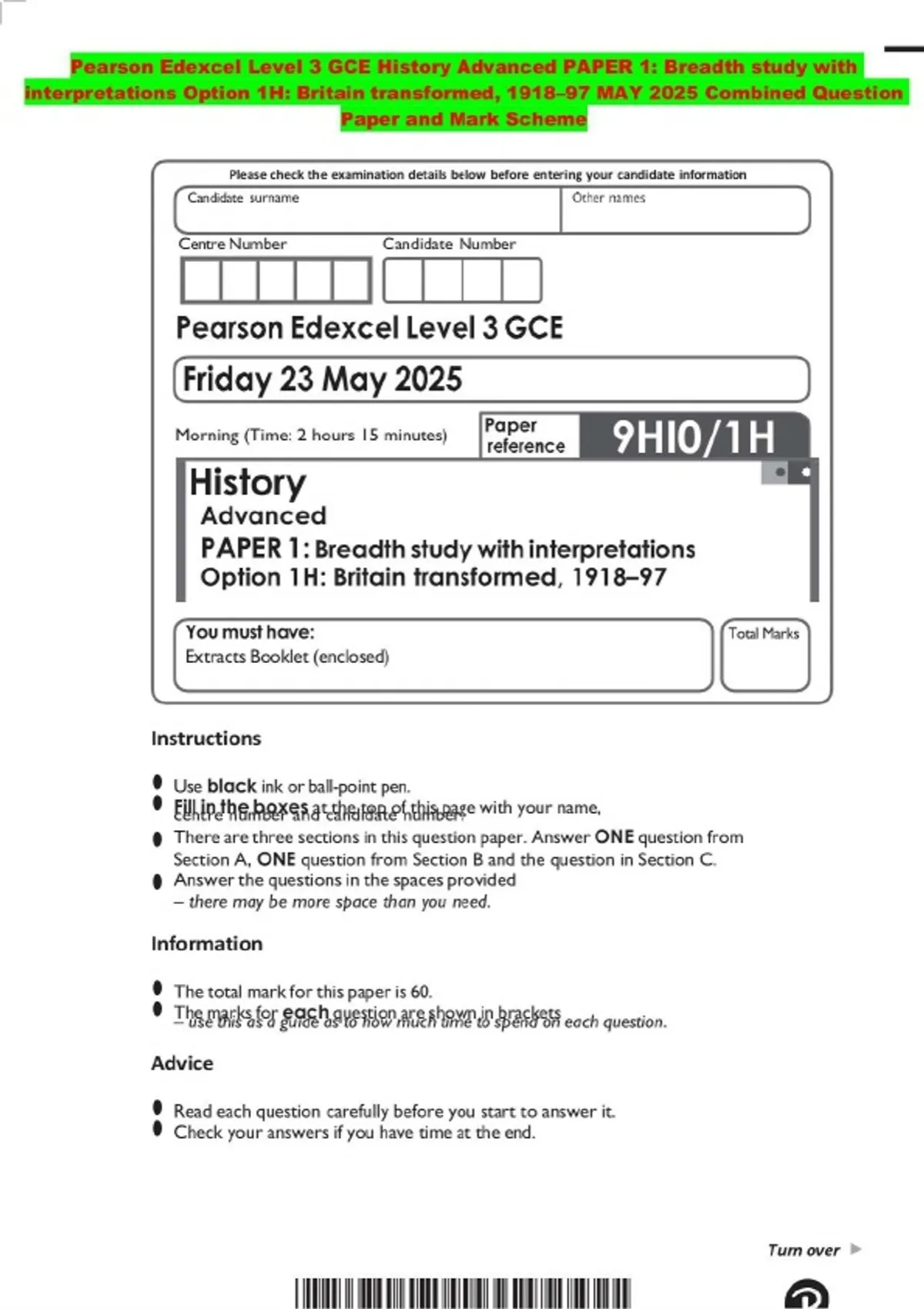 Pearson Edexcel Level 3 GCE History Advanced PAPER 1: Breadth study with interpretations Option 1H: Britain transformed, 1918–97 MAY 2025 Combined Question Paper and Mark Scheme