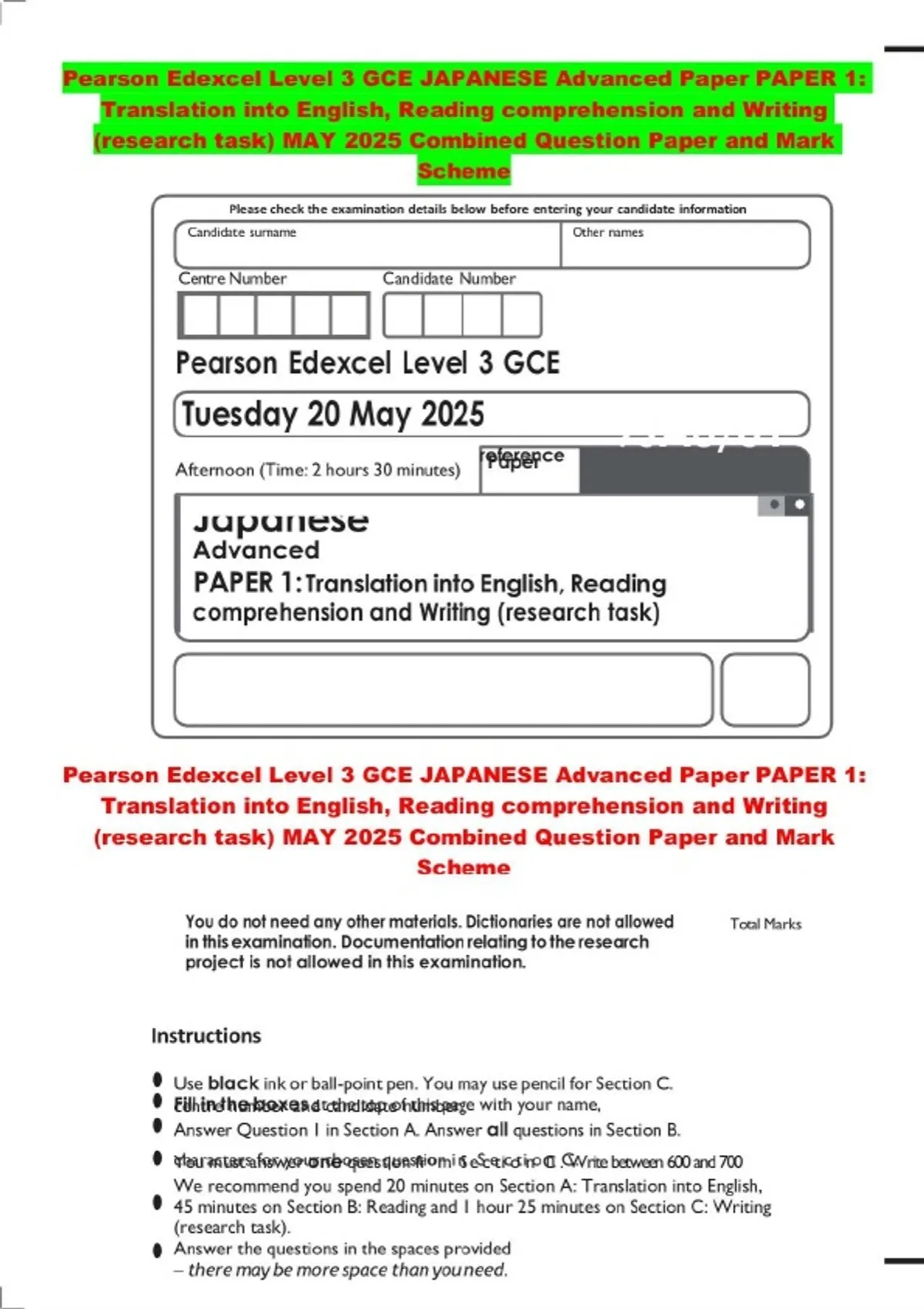 Pearson Edexcel Level 3 GCE JAPANESE Advanced Paper PAPER 1: Translation into English, Reading comprehension and Writing (research task) MAY 2025 Combined Question Paper and Mark Scheme