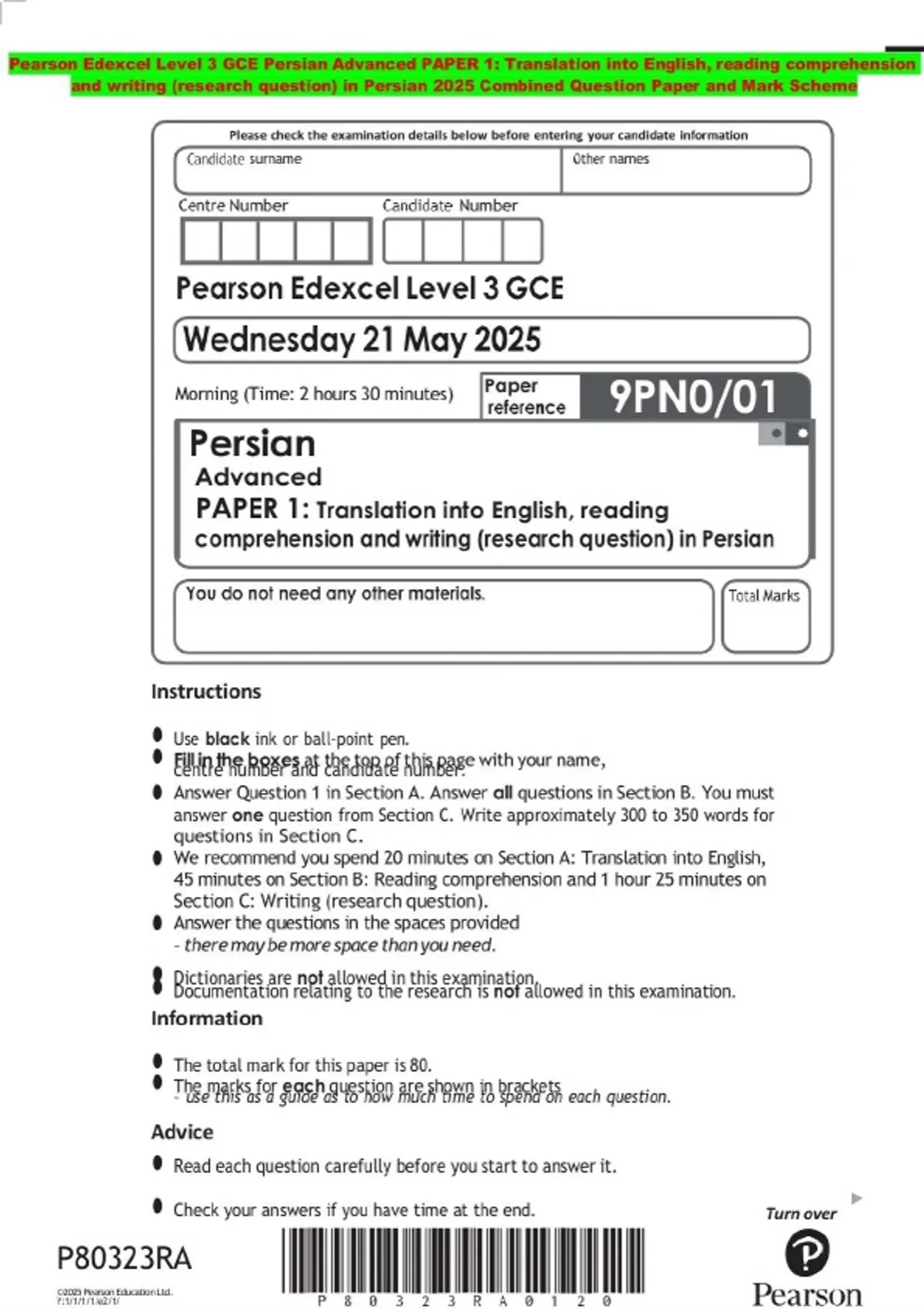 BUNDLE:::Pearson Edexcel Level 3 GCE Persian Advanced Paper 2025 Combined Question Paper and Mark Scheme