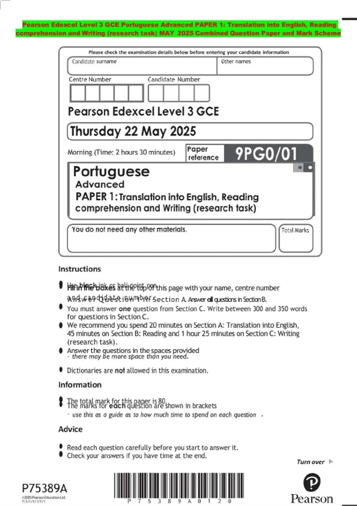 Pearson Edexcel Level 3 GCE Portuguese Advanced PAPER 1: Translation into English, Reading comprehension and Writing (research task) MAY 2025 Combined Question Paper and Mark Scheme
