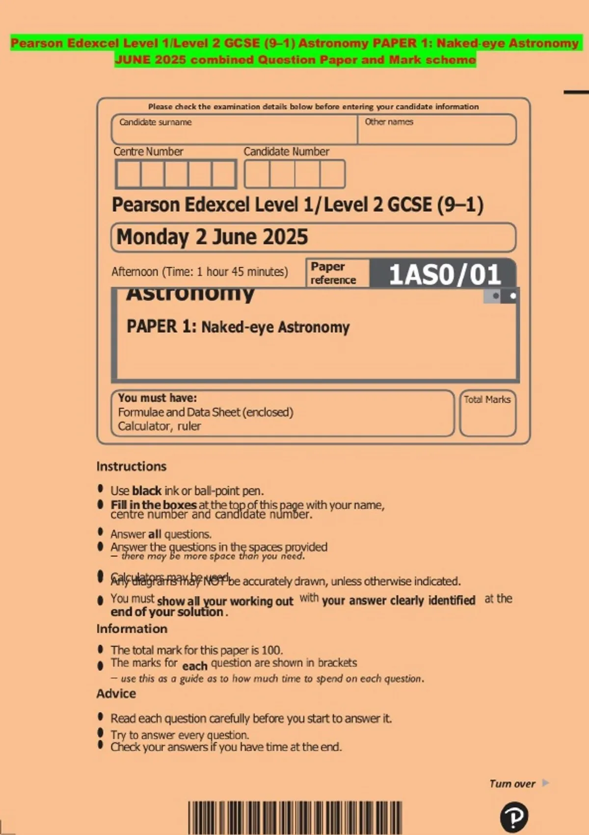 Pearson Edexcel Level 1/Level 2 GCSE (9–1) Astronomy PAPER 1: Naked-eye Astronomy JUNE 2025 combined Question Paper and Mark scheme
