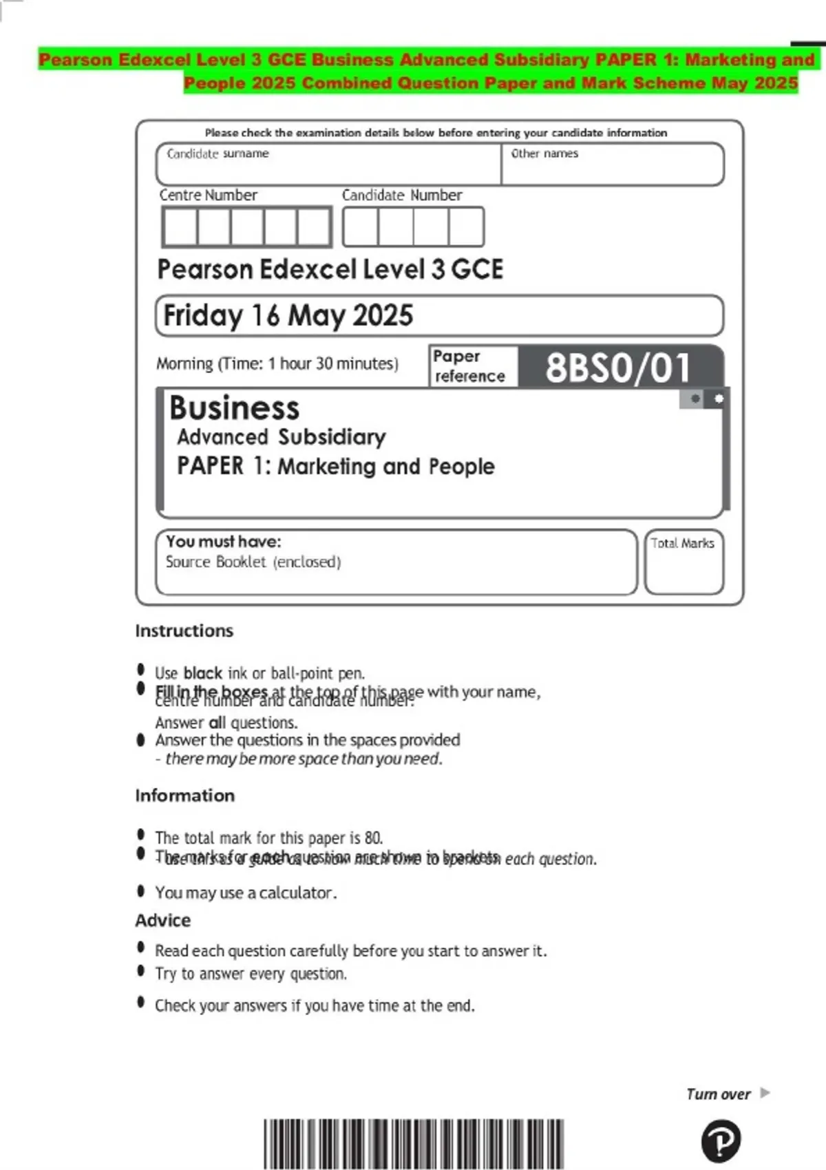Pearson Edexcel Level 3 GCE Business Advanced Subsidiary PAPER 1: Marketing and People 2025 Combined Question Paper and Mark Scheme May 2025