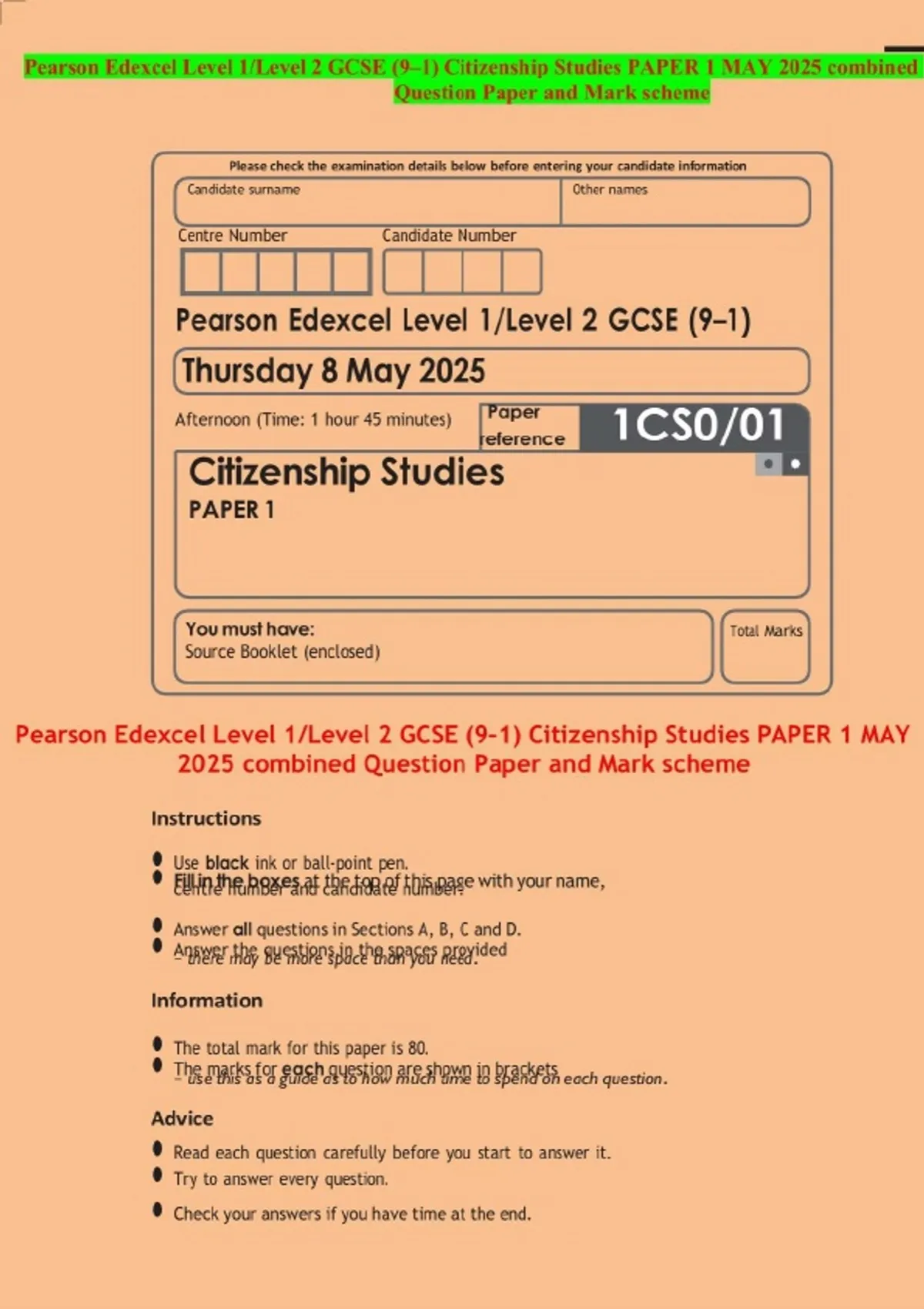 Pearson Edexcel Level 1/Level 2 GCSE (9–1) Citizenship Studies PAPER 1 MAY 2025 combined Question Paper and Mark scheme