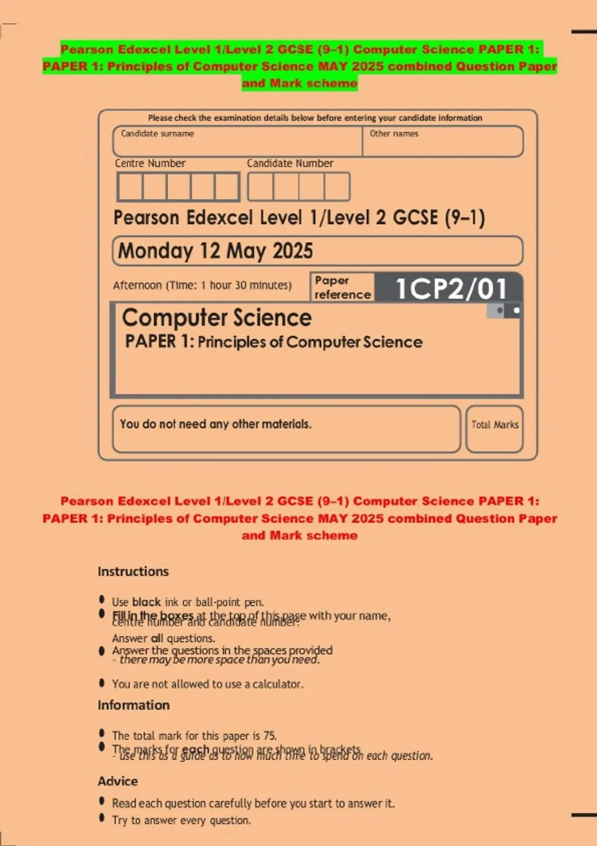 BUNDLE:::Pearson Edexcel Level 1/Level 2 GCSE (9–1) Computer Science 2025 Combined Question Paper and Mark Scheme