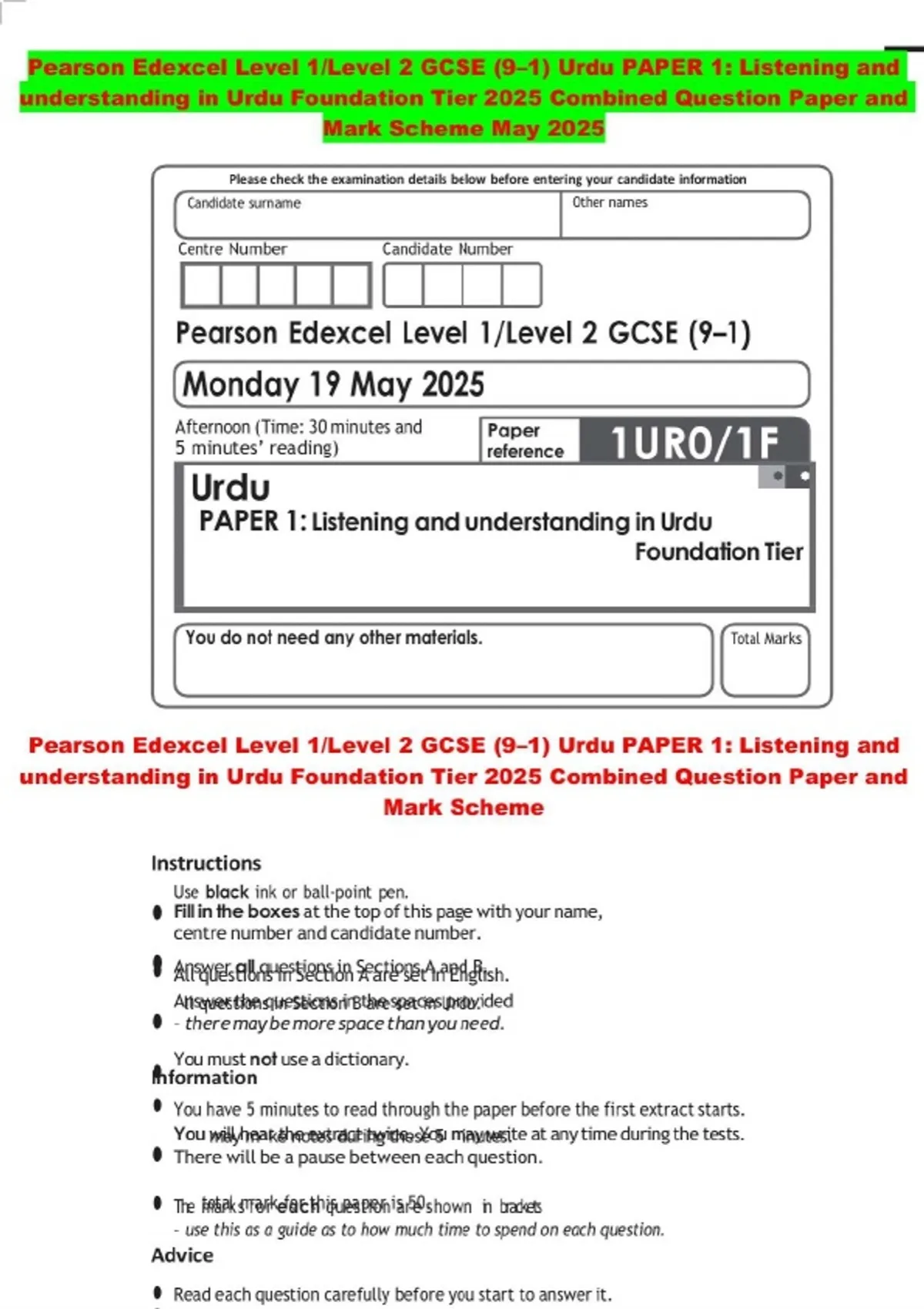 Pearson Edexcel Level 1/Level 2 GCSE (9–1) Urdu PAPER 1: Listening and understanding in Urdu Foundation Tier 2025 Combined Question Paper and Mark Scheme May 2025