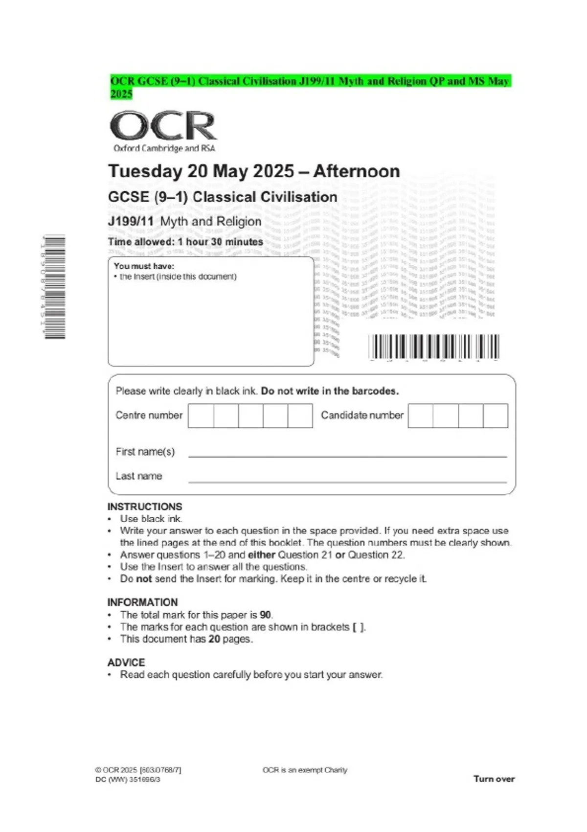 OCR GCSE (9–1) Classical Civilisation J199/11 Myth and Religion QP and MS May 2025