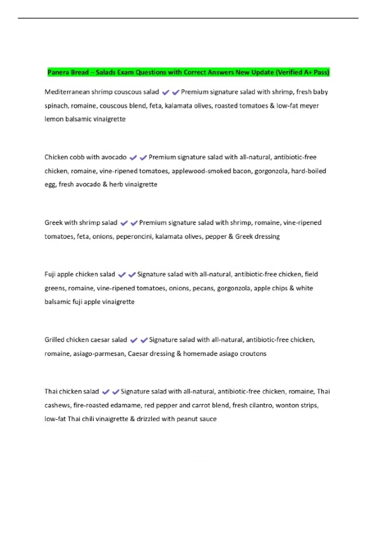 Panera Manager Test Exam Questions with Correct Answers New Update (Verified A+ Pass) 5 Exam (elaborations) Panera Menu Exam Questions with Correct Answers New Update (Verified A+ Pass) 6 Exam (elaborations) Panera Production Exam Questions with Correct Answers New Update (Verified A+ Pass) 7 Exam (elaborations) Panera Sandwich Test Questions wi