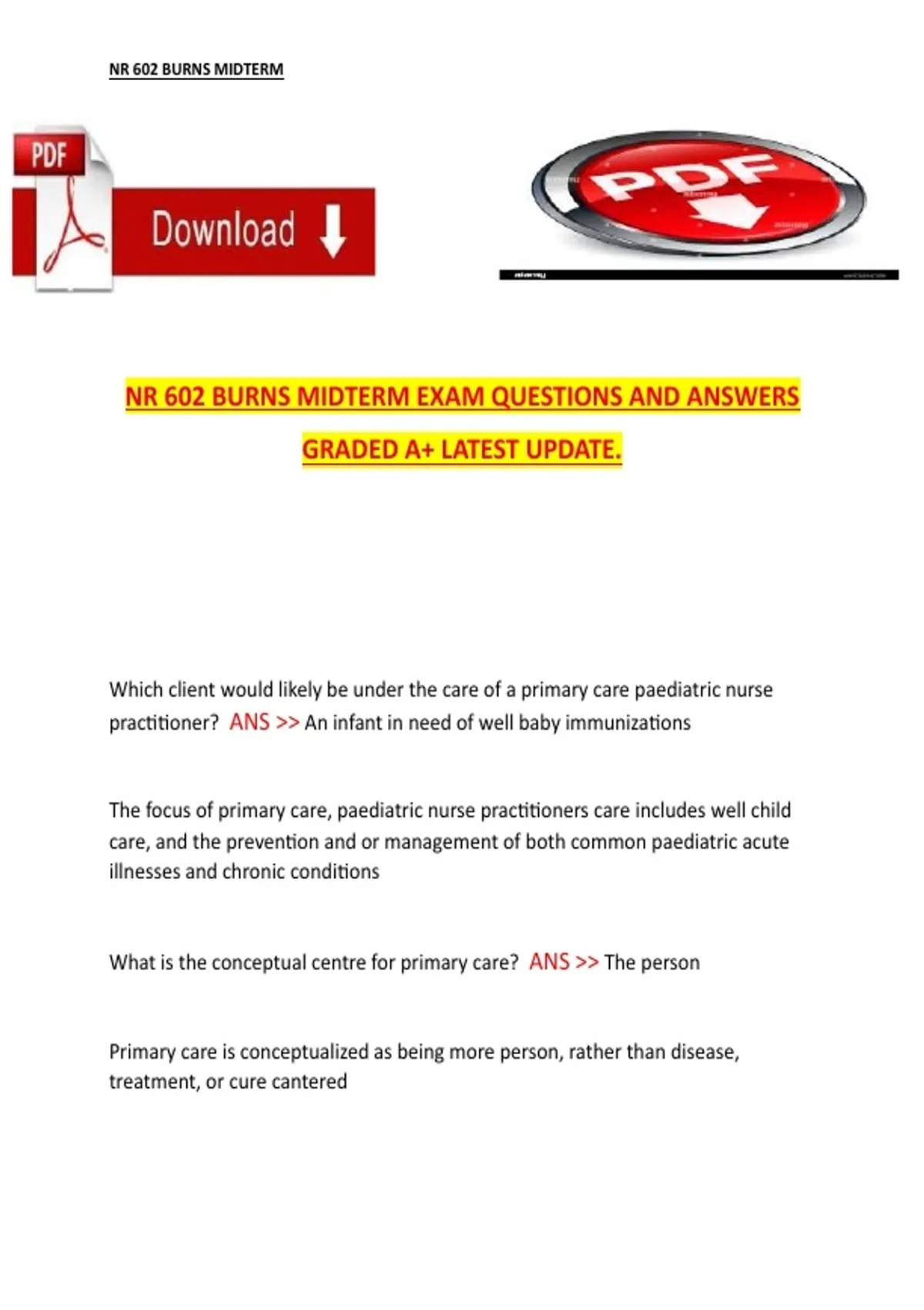 NR 602 Burns Midterm Exam – Questions and Answers, Latest Update (A+) NR 602 Final Content – Week 5 Exam Questions and Answers, Latest Update (A+) NR 602 Final Exam – Questions and Answers, Latest Update (A+) NR 602 Pediatric Midterm – Pediatric Nursing, NR 602, [Institution Name], Academic Year [Insert Year] – Study Set with Exam Questions and Ver