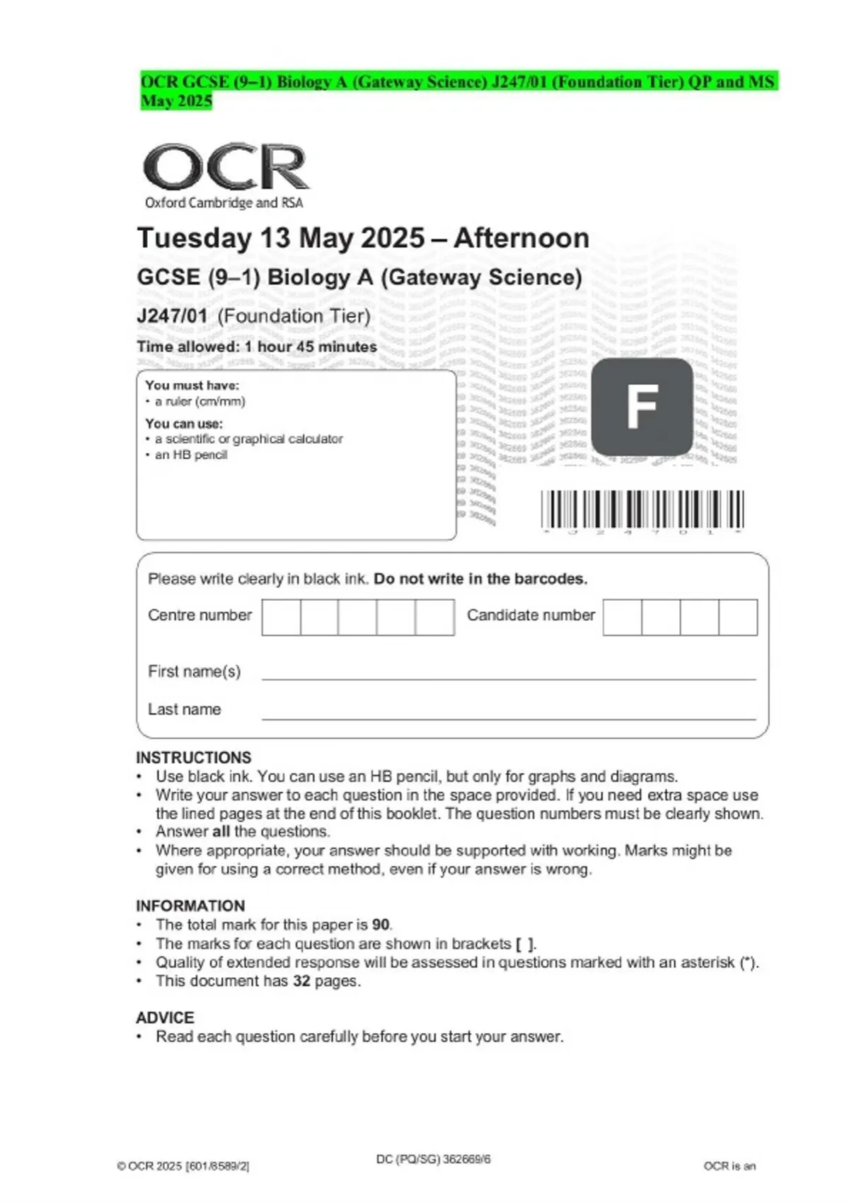 BUNDLE::: OCR GCSE (9–1) Biology 2025 Combined Question Paper and Mark Scheme