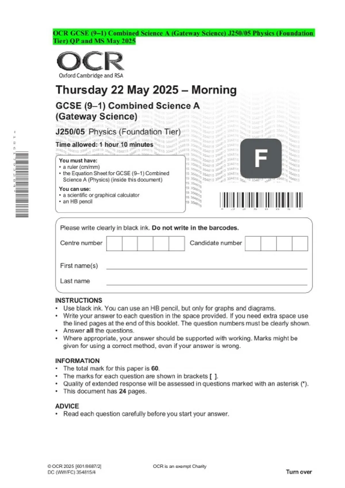 OCR GCSE (9–1) Combined Science A (Gateway Science) J250/05 Physics (Foundation Tier) QP and MS May 2025