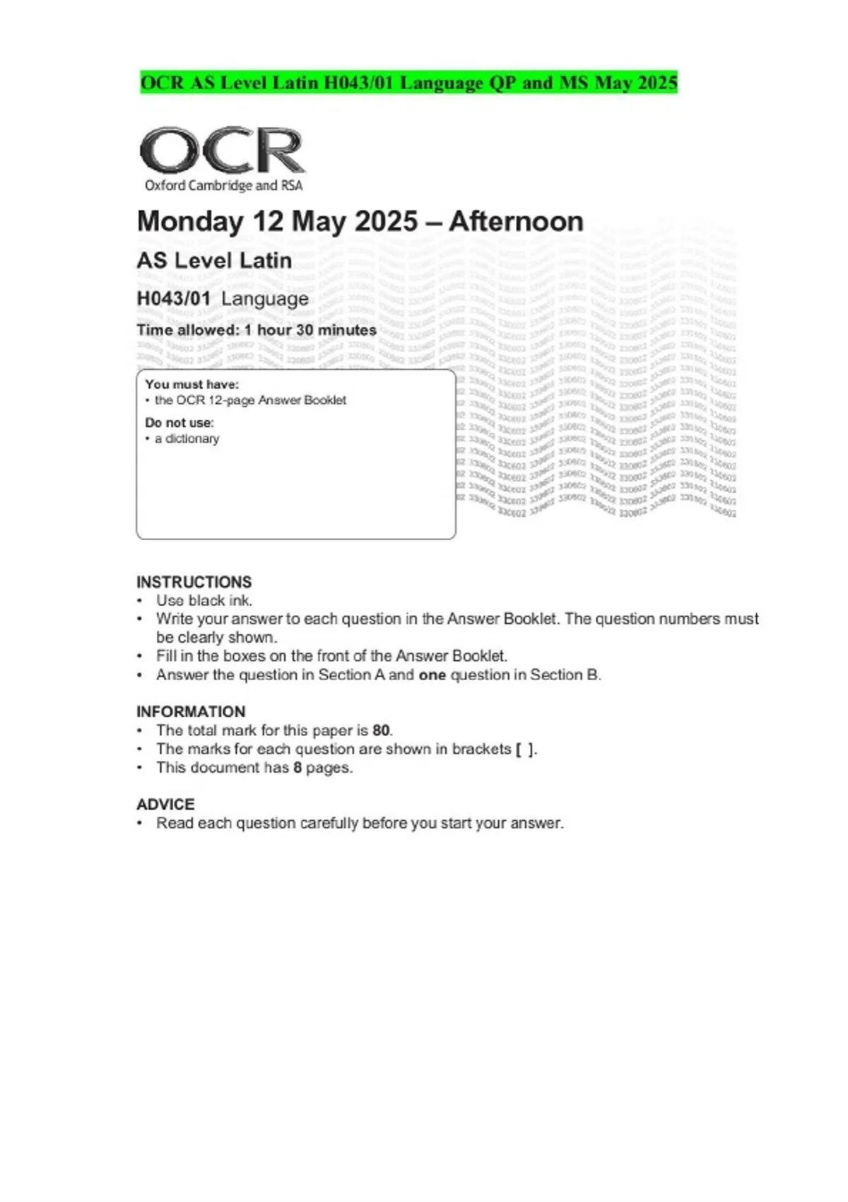 OCR AS Level Latin H043/01 Language QP and MS May 2025