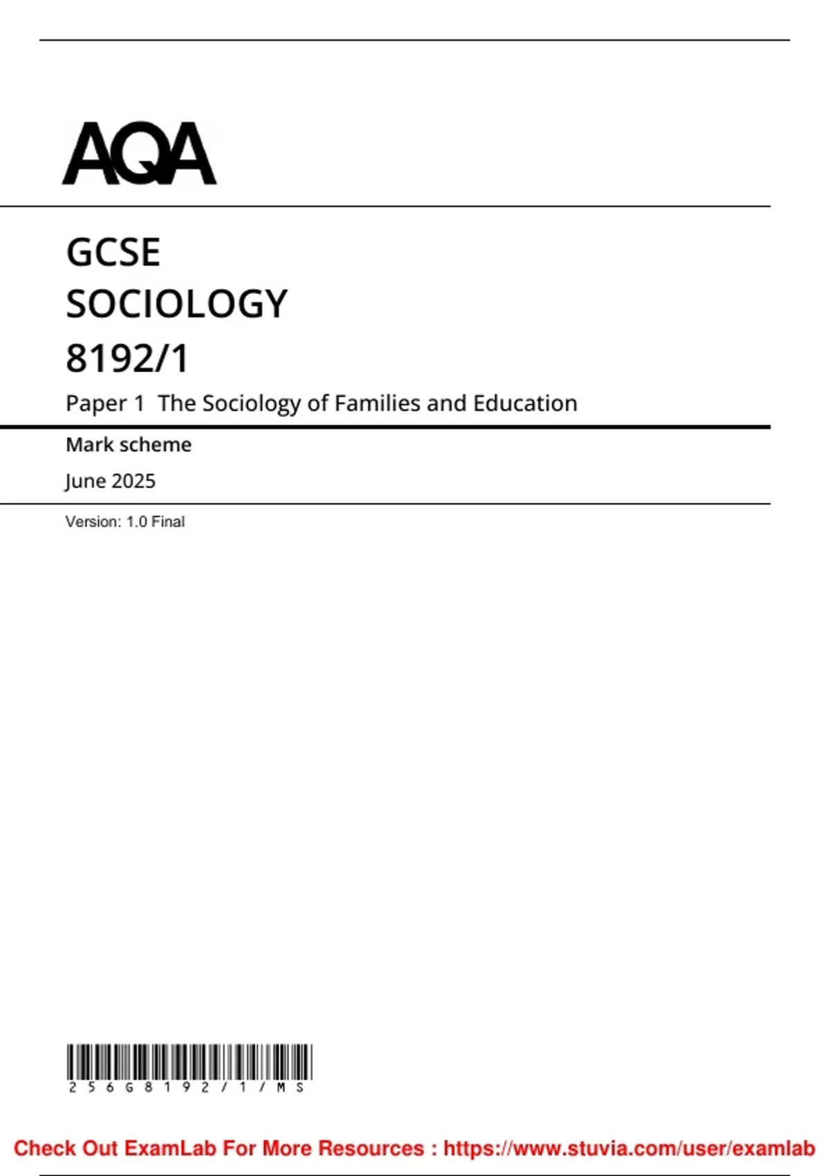GCSE Sociology AQA Paper 1 + Mark Scheme 2025