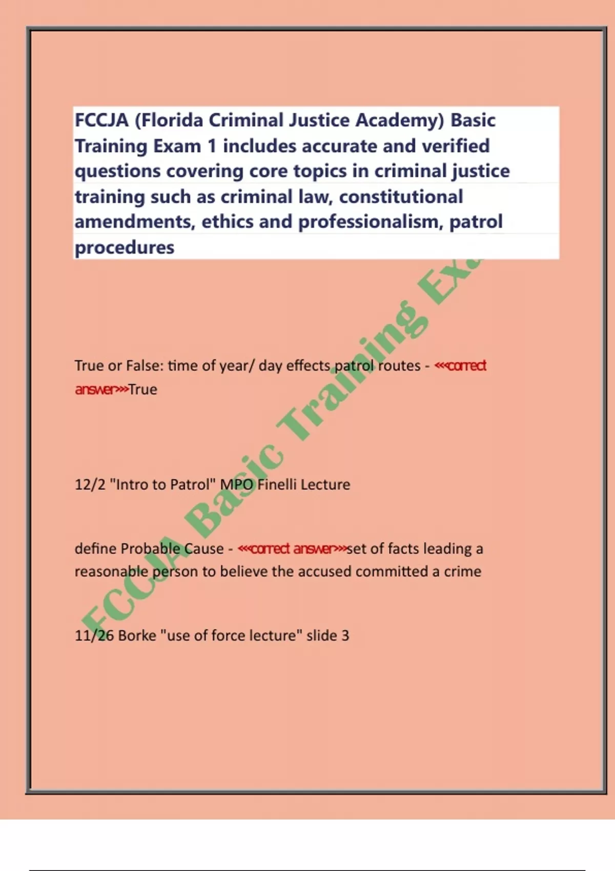 FCCJA (Florida Criminal Justice Academy) Basic Training Exam 3 includes accurate and verified questions covering core topics in criminal justice training such as criminal law, constitutional amendments, ethics and professionalism, patrol procedures,