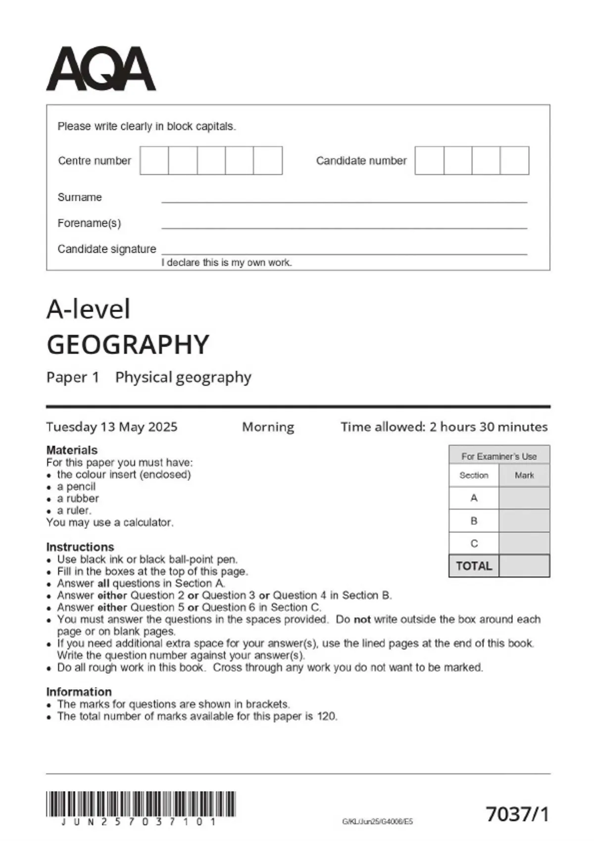 2025 AQA A-LEVEL Geography (7037) ALL EXAMS WITH MERGED QUESTION PAPERS AND MARK SCHEMES