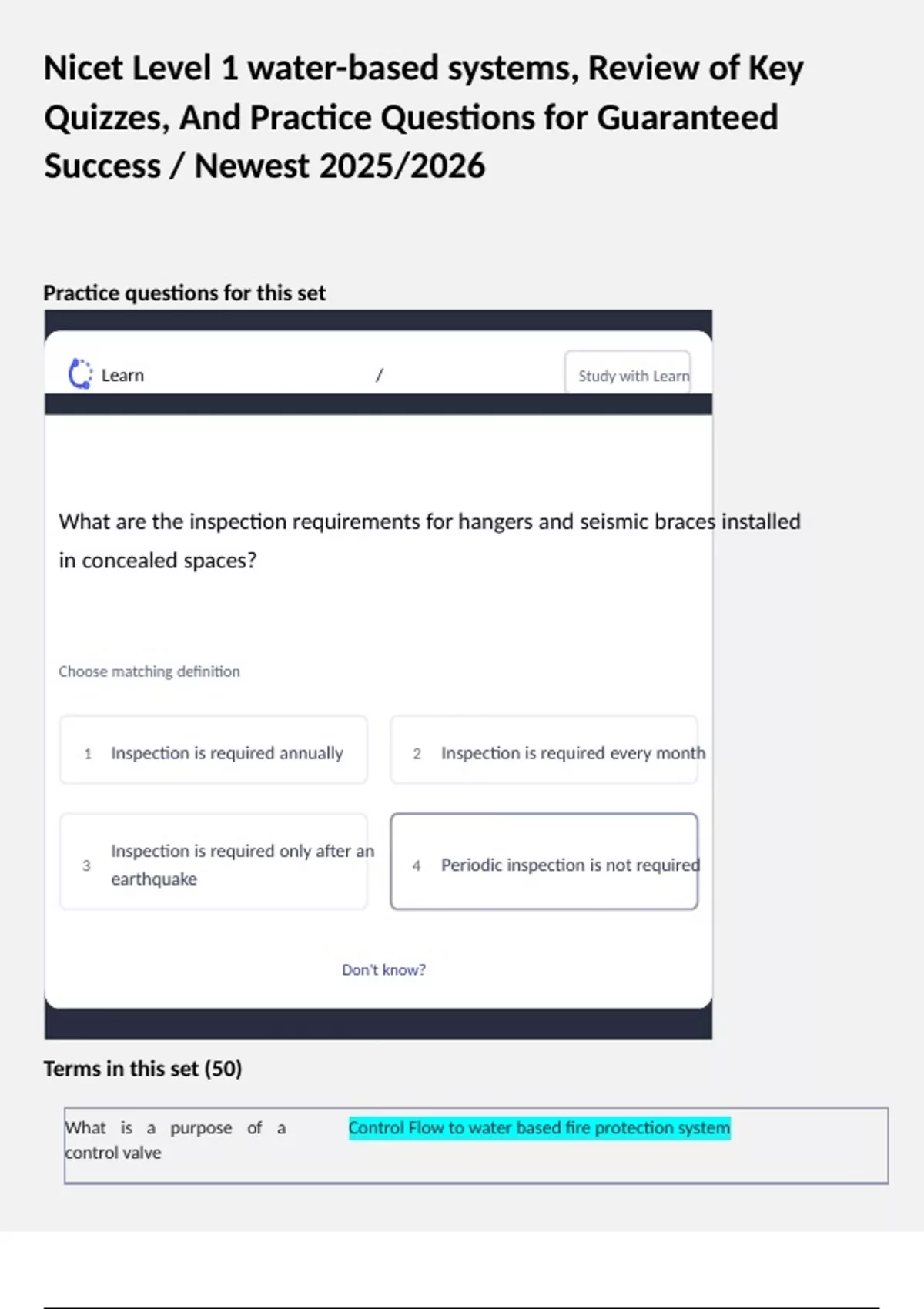 1 Exam (elaborations) Nicet Level 1 water-based systems, Review of Key Quizzes, And Practice Questions for Guaranteed Success / Newest 2025/2026 2 Exam (elaborations) NICET LEVEL 1 / NICET LEVEL 2 & NICET LEVEL 3 / STUDY GUIDE QUESTIONS (2017 NEWEST COMPILATION REVIEW) COMPREHENSIVE STUDY GUIDE – EXPERT STRATEGIES, REVIEW OF KEY QUIZZES, AND PRACT