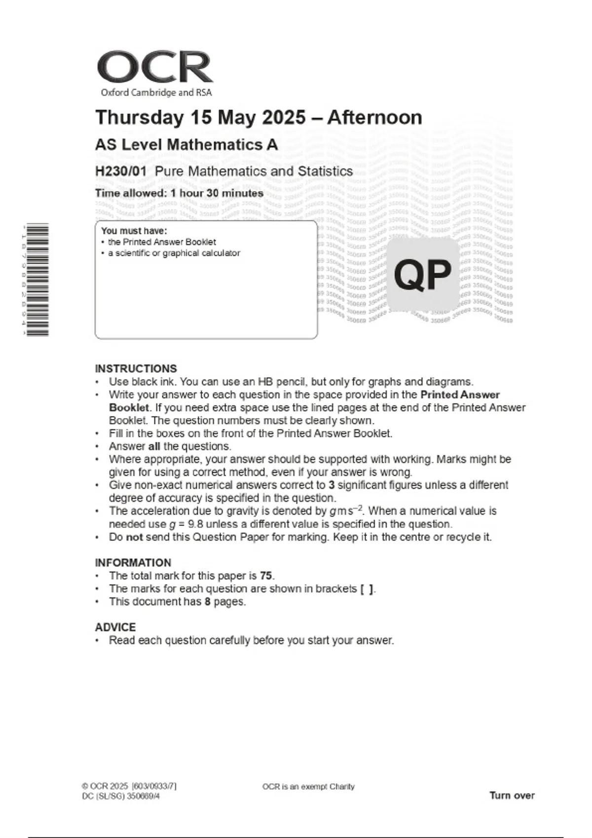 2025 OCR AS Level Mathematics A H230/02 Pure Mathematics and Mechanics Combined Question Paper & Final Marking Scheme 3 Exam (elaborations) 2025 OCR A Level Mathematics A H240/03 Pure Mathematics and Mechanics Combined Question Paper & Final Marking Scheme 4 Exam (elaborations) 2025 OCR A Level Mathematics A H240/02 Pure Mathematics and Statistic