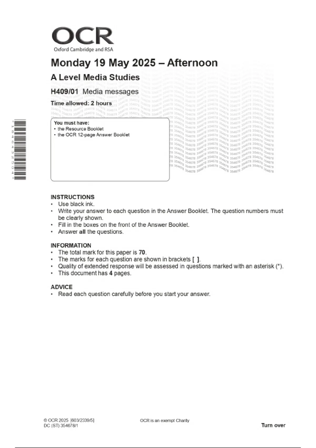 2025 OCR A Level Media Studies H409/01 Media messages Combined Question Paper & Final Marking Scheme 2 Exam (elaborations) 2025 OCR A Level Media Studies H409/02 Evolving media Combined Question Paper & Final Marking Scheme