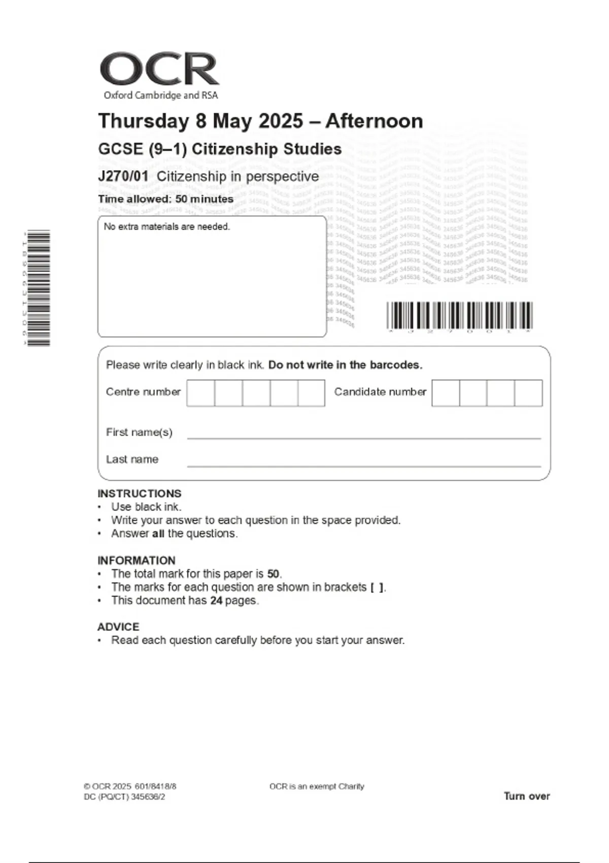 2025 OCR GCSE (9–1) Citizenship Studies J270/01 2025 OCR GCSE (9–1) Citizenship Studies J270/01 Citizenship in perspective Combined Question Paper & Final Marking Scheme 2 Exam (elaborations) 2025 OCR GCSE (9–1) Citizenship Studies J270/02 Citizenship in action Combined Question Paper & Final Marking Scheme 3 Exam (elaborations) 2025 OCR GCSE (9–