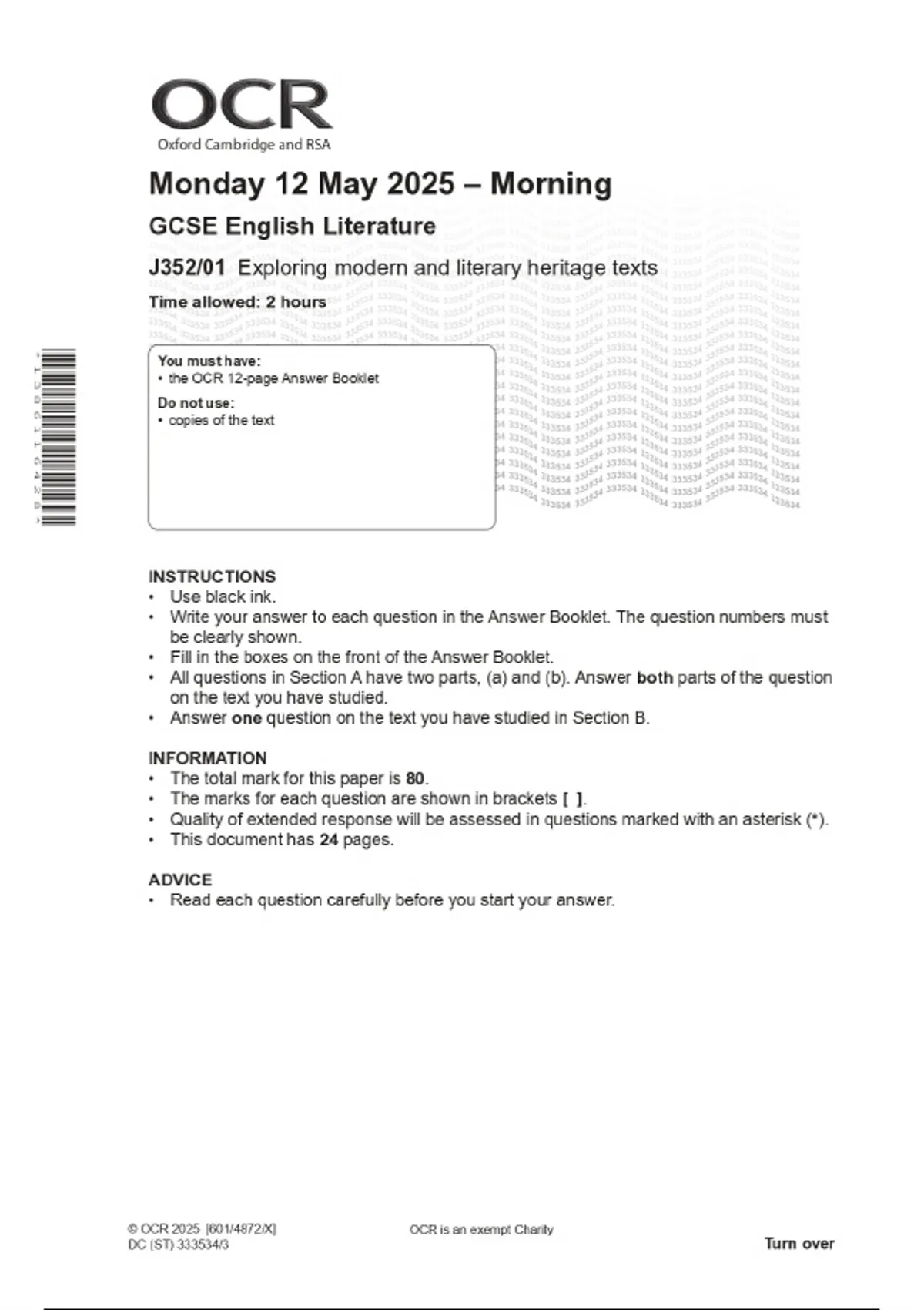 2025 OCR GCSE English Literature J352/01 Exploring modern and literary heritage texts Combined Question Paper & Final Marking Scheme 2 Exam (elaborations) 2025 OCR GCSE English Literature J352/02 Exploring poetry and Shakespeare Combined Question Paper & Final Marking Schem