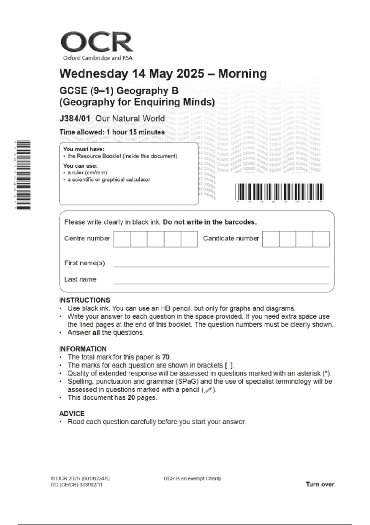 2025 OCR GCSE (9–1) Geography B (Geography for Enquiring Minds) J384/01 Our Natural World Combined Question Paper & Final Marking Scheme 2 Exam (elaborations) 2025 OCR GCSE (9–1) Geography B (Geography for Enquiring Minds) J384/02 People and Society Combined Question Paper & Final Marking Scheme 3 Exam (elaborations) 2025 OCR GCSE (9–1) Geography