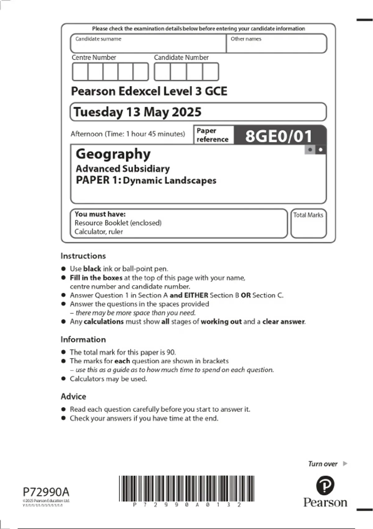 2025 Pearson Edexcel Level 3 GCE Tuesday 13 May 2025 Geography Advanced Subsidiary PAPER 1: Dynamic Landscapes Combined Question Paper & Marking Scheme 2 Exam (elaborations) 2025 Pearson Edexcel Level 3 GCE Wednesday 21 May 2025 Geography Advanced Subsidiary PAPER 2: Dynamic Places Combined Question Paper & Marking Scheme 3 Exam (elaborations) 20