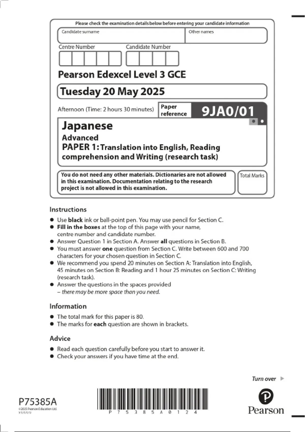 2025 Pearson Edexcel Level 3 GCE Thursday 12 June 2025 Japanese Advanced PAPER 3: Listening, reading and writing Combined Question Paper & Marking Scheme 2 Exam (elaborations) 2025 Pearson Edexcel Level 3 GCE Tuesday 3 June 2025 Japanese Advanced PAPER 2: Translation into Japanese and written response to works Combined Question Paper & Marking Sch