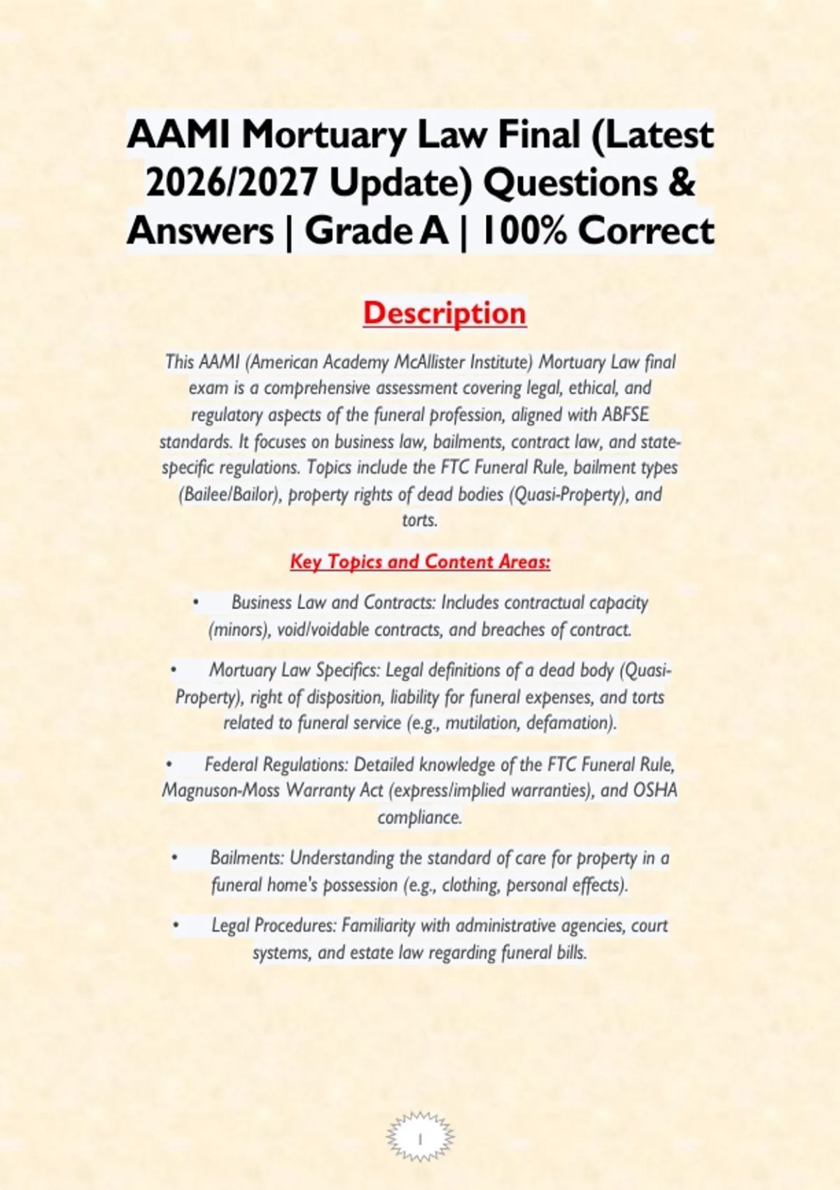 1 Exam (elaborations) AAMI Mortuary Law Final (Latest 2026/2027 Update) Questions & Answers | Grade A | 100% Correct 2 Exam (elaborations) AAMI Mortuary Law Final - Weeks 1 – 8 (Latest 2026/2027 Update) 150 Questions & Answers | Grade A | 100% Correct