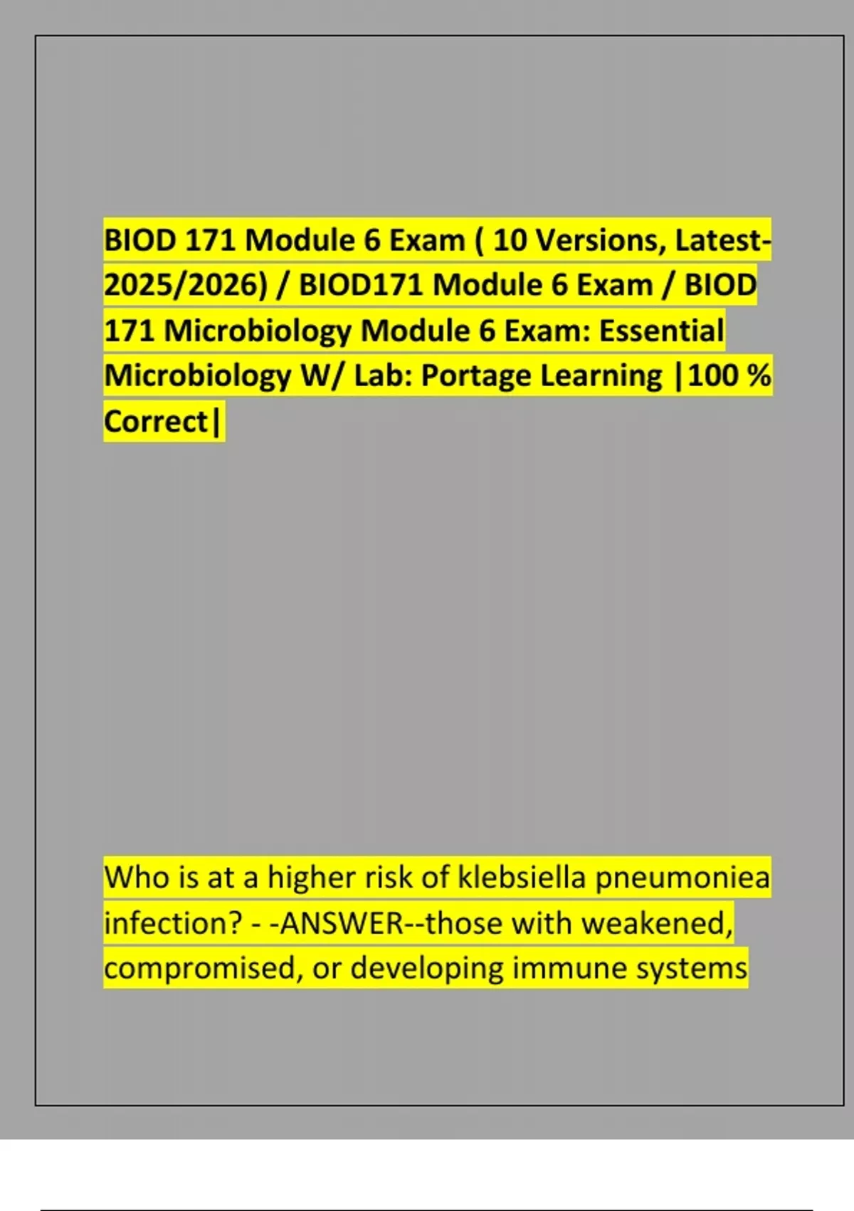BIOD 171 Module 6 Exam ( 10 Versions, Latest 2025/2026) / BIOD171 Module 6 Exam / BIOD 171 Microbiology Module 6 Exam: Essential Microbiology W/ Lab: Portage Learning |100 % Correct| Who is at a higher risk of klebsiella pneumoniea infe
