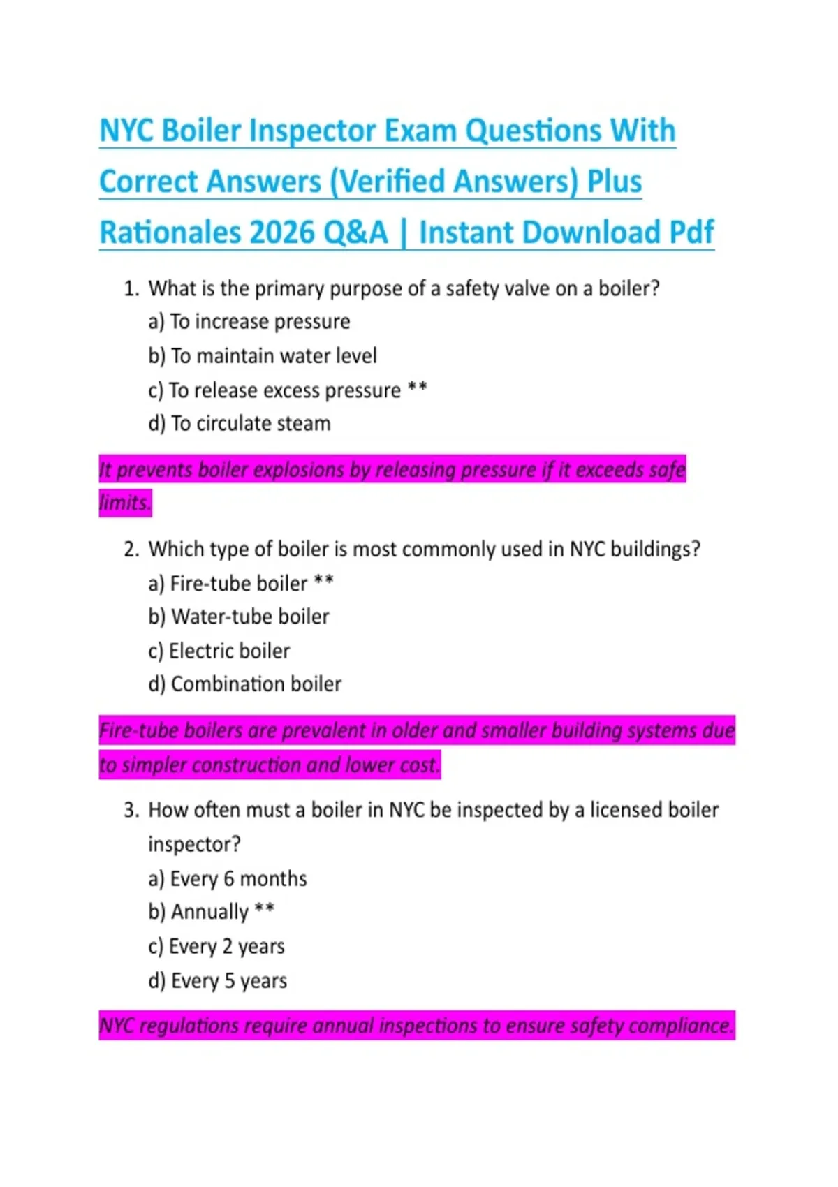 Bundle for NYC Boiler Inspector Exam Questions With Correct Answers (Verified Answers) Plus Rationales 2026 Q&A | Instant Download Pdf