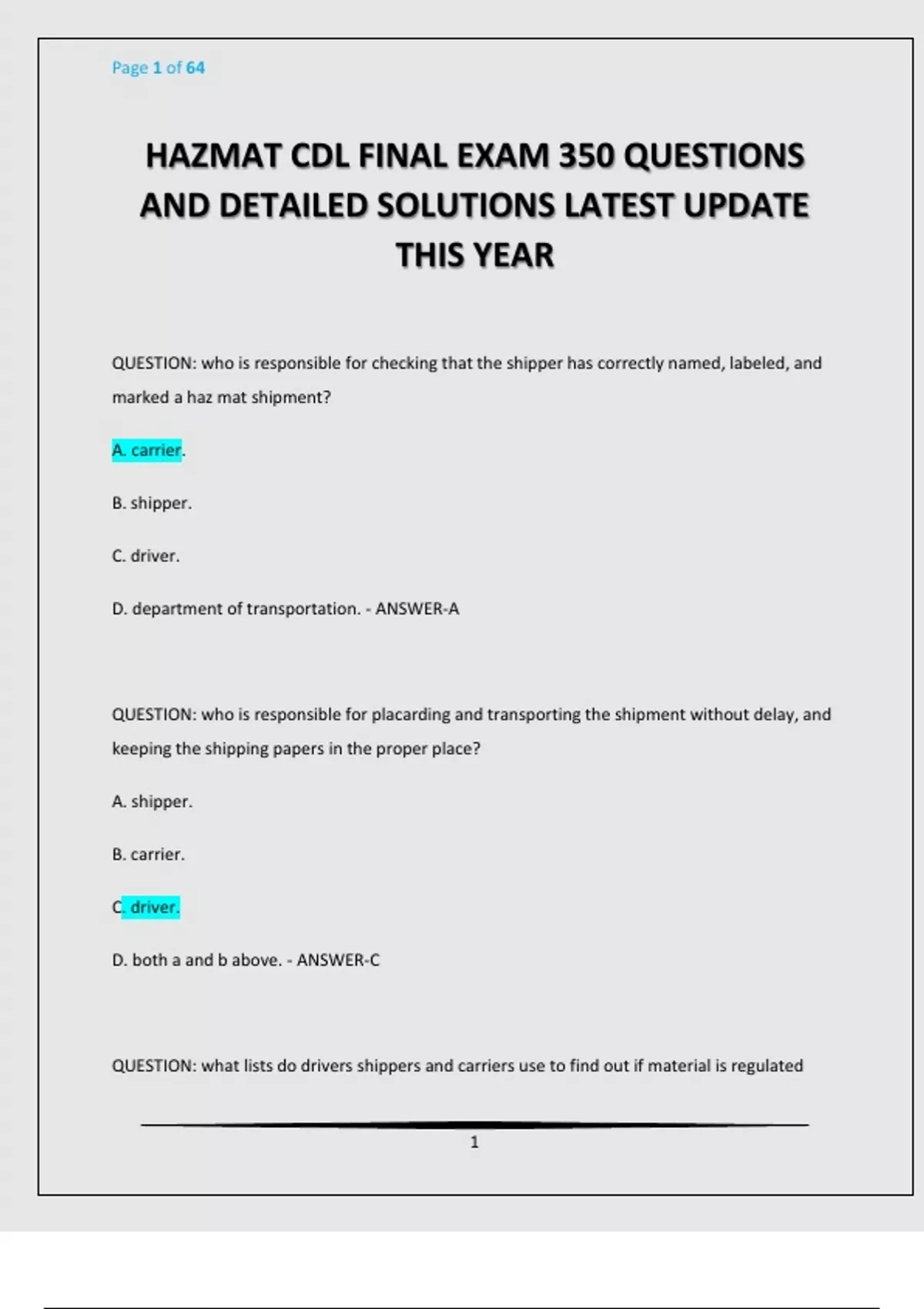 HAZMAT CDL FINAL EXAM 350 QUESTIONS AND DETAILED SOLUTIONS LATEST UPDATE THIS YEAR