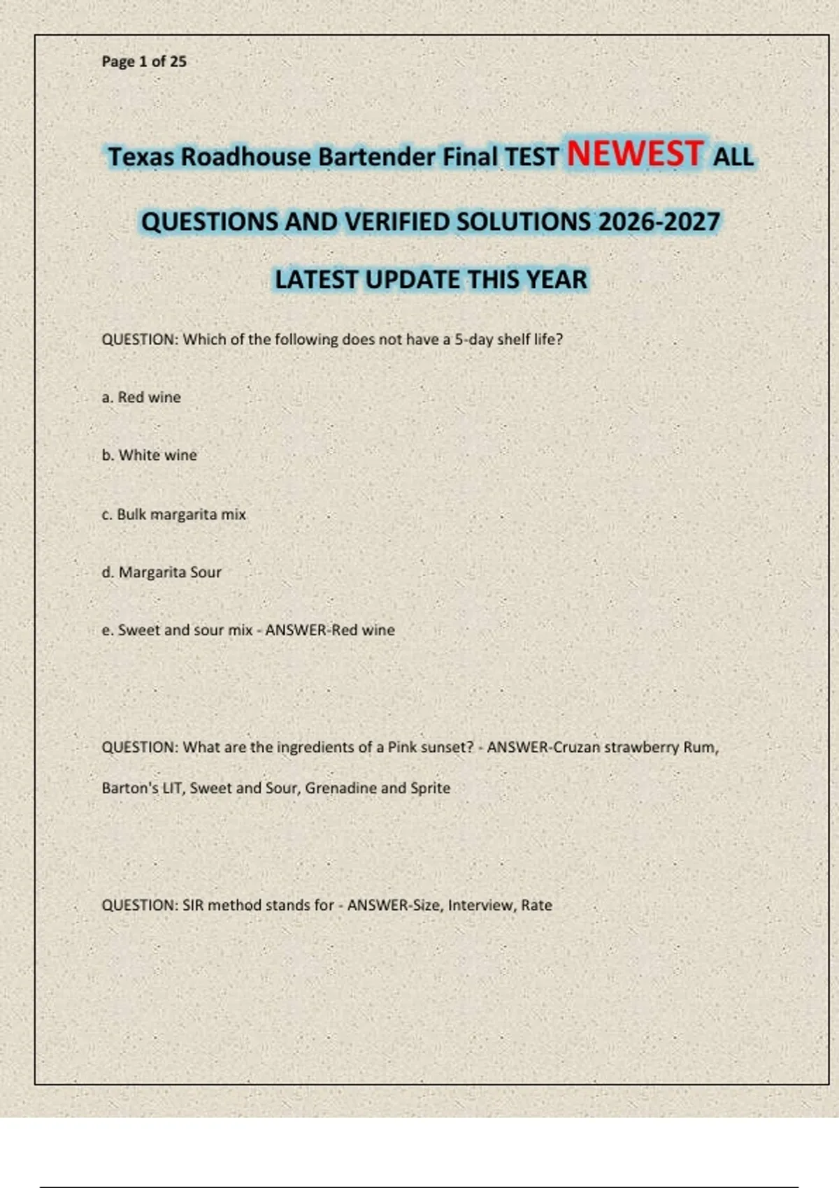 Texas Roadhouse Bartender Final TEST NEWEST ALL QUESTIONS AND VERIFIED SOLUTIONS LATEST UPDATE THIS YEAR