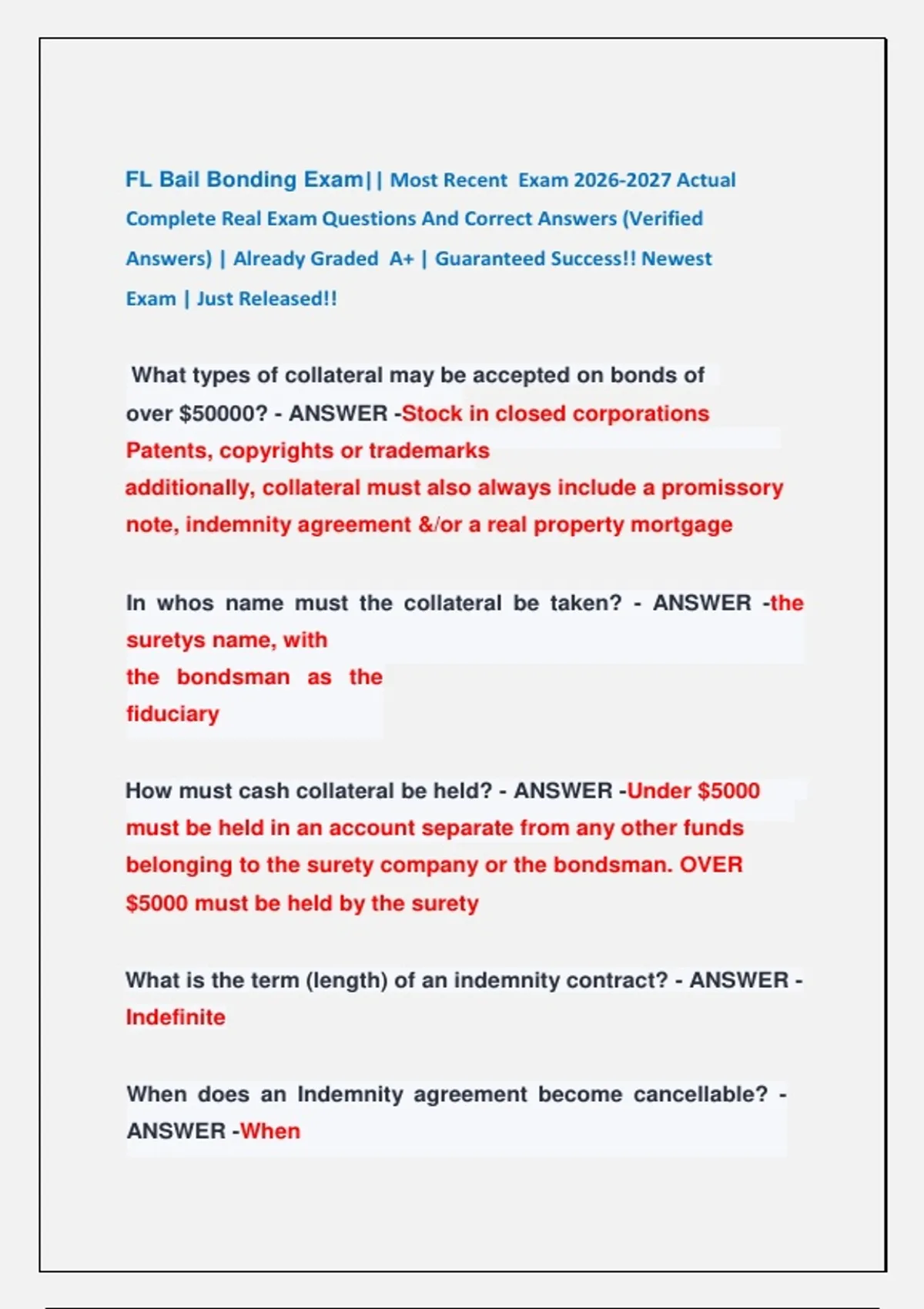 FLORIDA BAIL BOND STATE LICENSING TEST GUIDE || MOST RECENT EXAM ACTUAL COMPLETE REAL EXAM QUESTIONS AND CORRECT ANSWERS(VERIFIED ANSWERS) ALREADY GRADED A+ FL Bail Bonding Exam|| Most Recent Exam Actual Complete Real Exam Questions And Correct Answers (Verified Answers) | Already Graded A+ | Guaranteed Success!! Newest Exam |