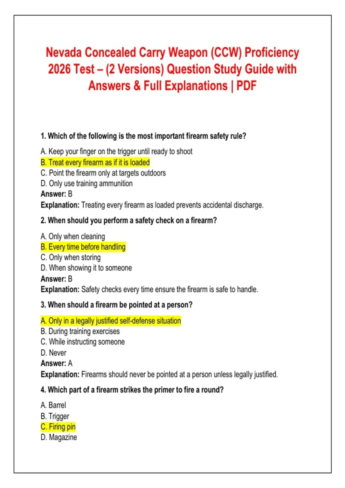Nevada Concealed Carry Weapon (CCW) Proficiency 2026 Test – (2 Versions) Question Study Guide with Answers & Full Explanations | PDF