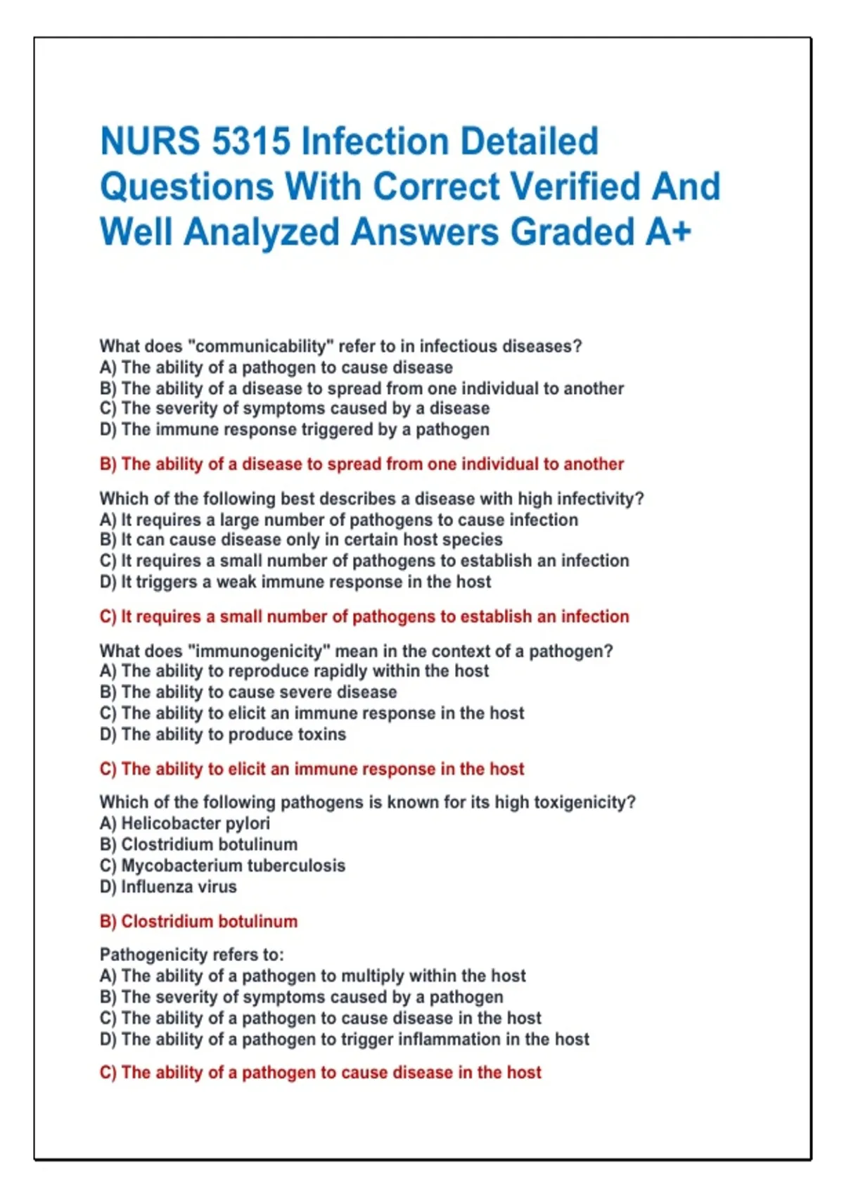 NURS 5315 Infection Detailed Questions With Correct Verified And Well Analyzed Answers Graded A+