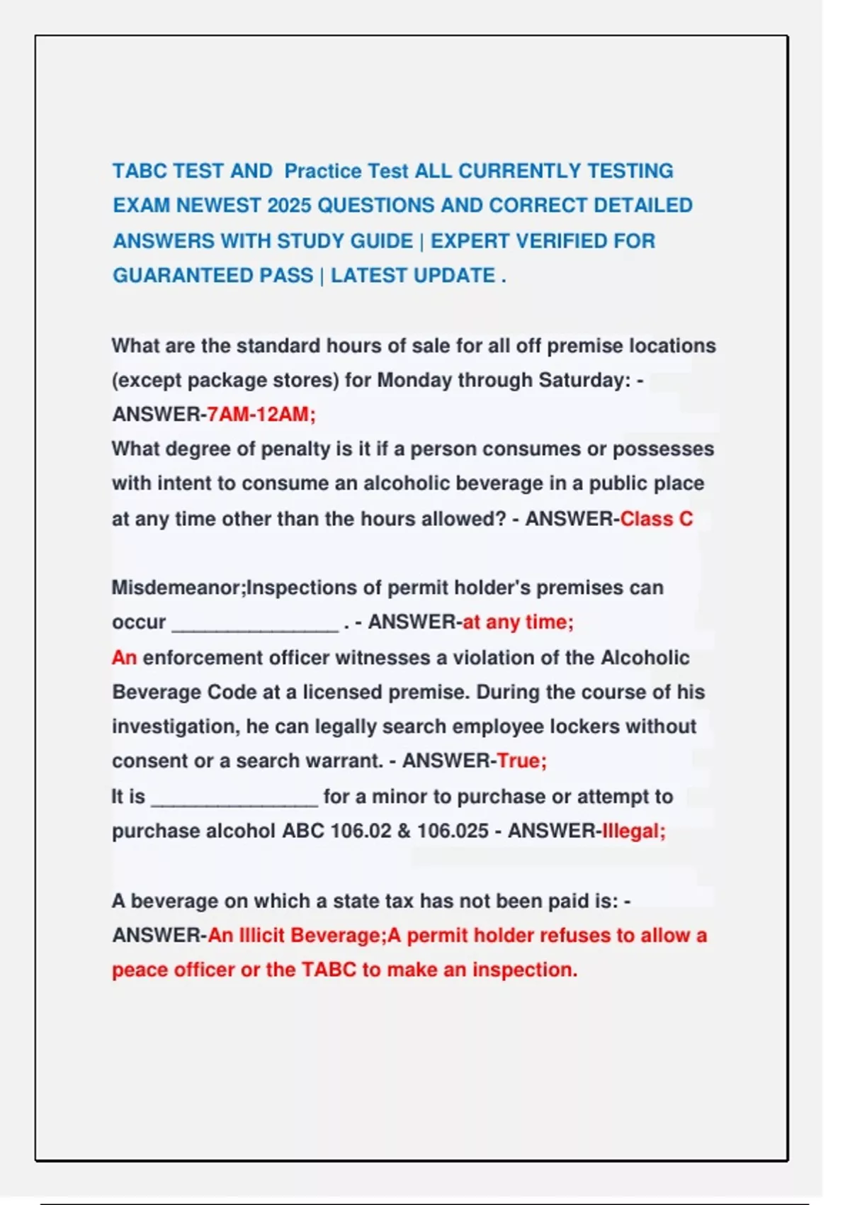 TABC FINAL EXAM 2025/2026 /ACTUAL COMPLETE REAL EXAM QUESTIONS AND CORRECT ANSWERS TABC TEST AND Practice Test ALL CURRENTLY TESTING EXAM NEWEST 2025 TABC EXAM 2025/2026 | ACTUAL COMPLETE REAL EXAM TEST (questions and verified answers) TABC Final Exam || Most Recent Exam