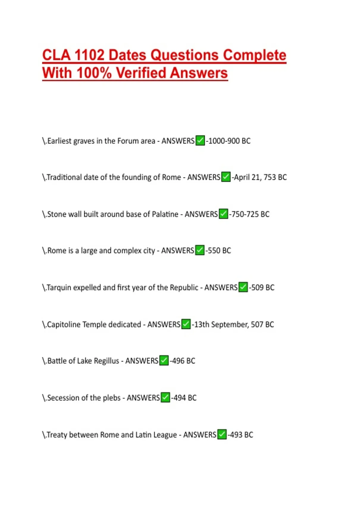 1 Exam (elaborations) CLA 1102 Dates Questions Complete With 100% Verified Answers 2 Exam (elaborations) CLA 1102 Daily Life Test 1 Questions Complete With 100% Verified Answers 3 Exam (elaborations) CLA 1102 - Midterm 1 - Daily Life Questions And Verified Answers 4 Exam (elaborations) CLA 1102 - Midterm 1 – History Exam Questions Complete With