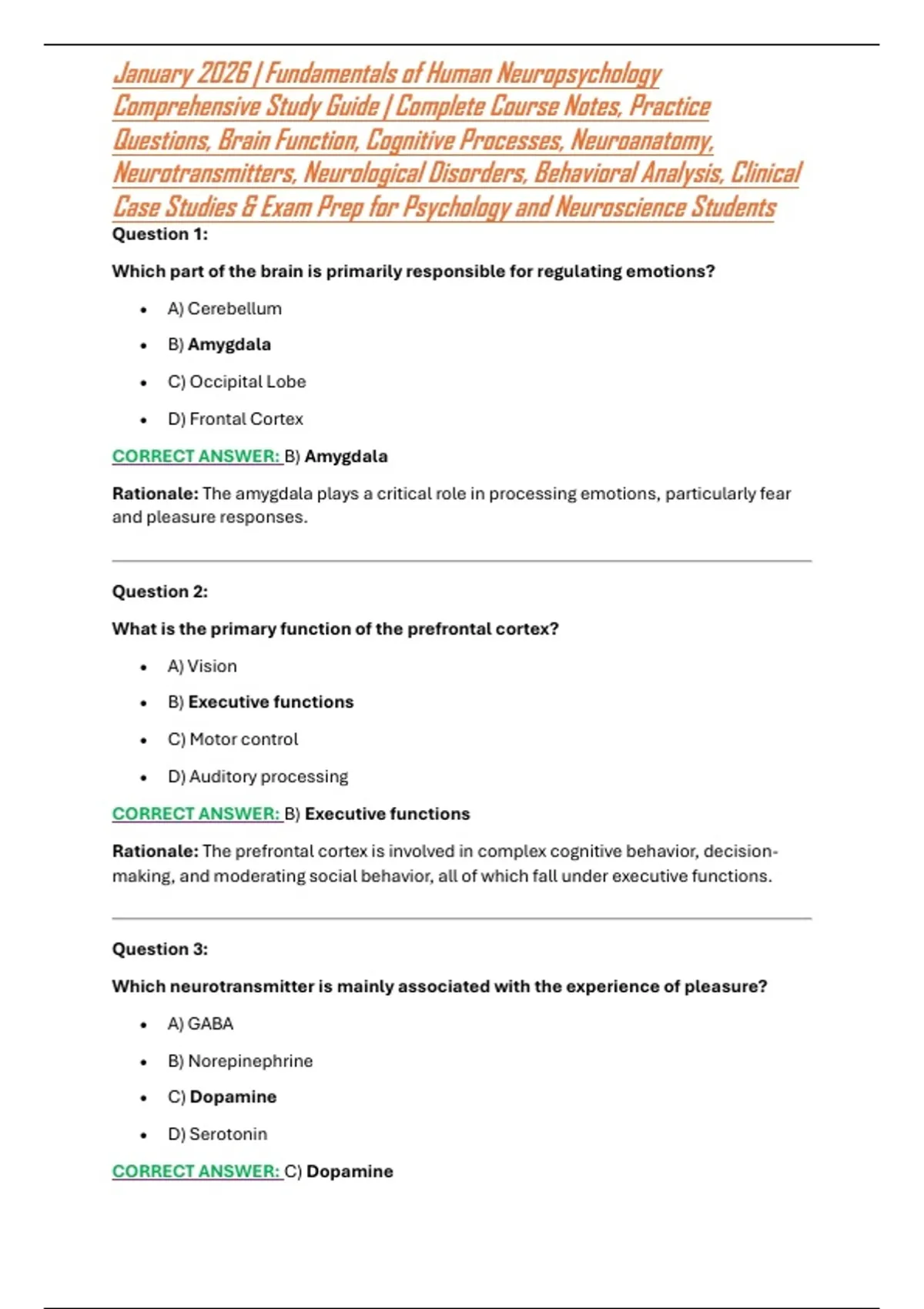January 2026 | Fundamentals of Human Neuropsychology Comprehensive Study Guide | Complete Course Notes, Practice Questions, Brain Function, Cognitive Processes, Neuroanatomy, Neurotransmitters, Neurological Disorders, Behavioral Analysis, Clinical Case St