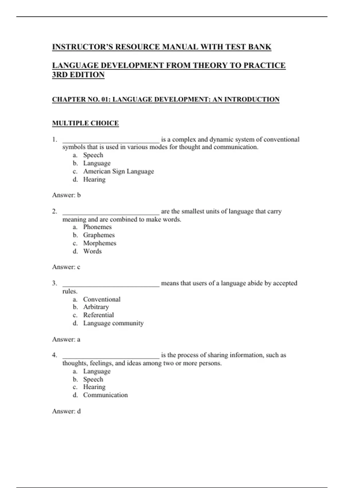 This document contains the complete Instructor’s Resource Manual with Test Bank for Language Development: From Theory to Practice, 3rd Edition by Khara L. Pence Turnbull and Laura M. Justice. It includes instructor guidance, learning objectives, teaching notes, answer keys, and a full set of chapter-based test questions covering language acquisition, developmental milestones, and applied practice. The material is fully aligned with the 3rd edition and is ideal for exam preparation, quizzes, and instructional support in speech-language pathology, education, and child language development courses.