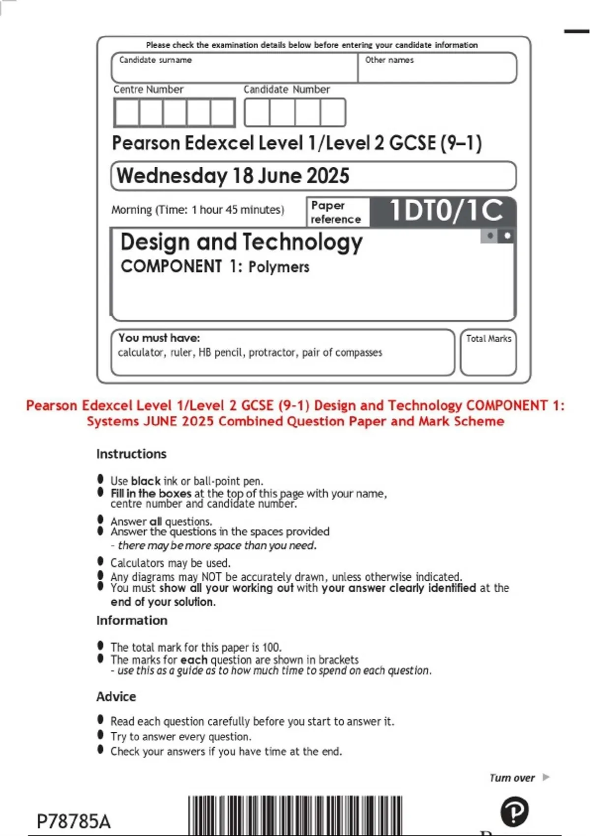BUNDLE ::: Pearson Edexcel Level 1/Level 2 GCSE (9–1) Design and Technology Question Paper with Mark Scheme / 2025