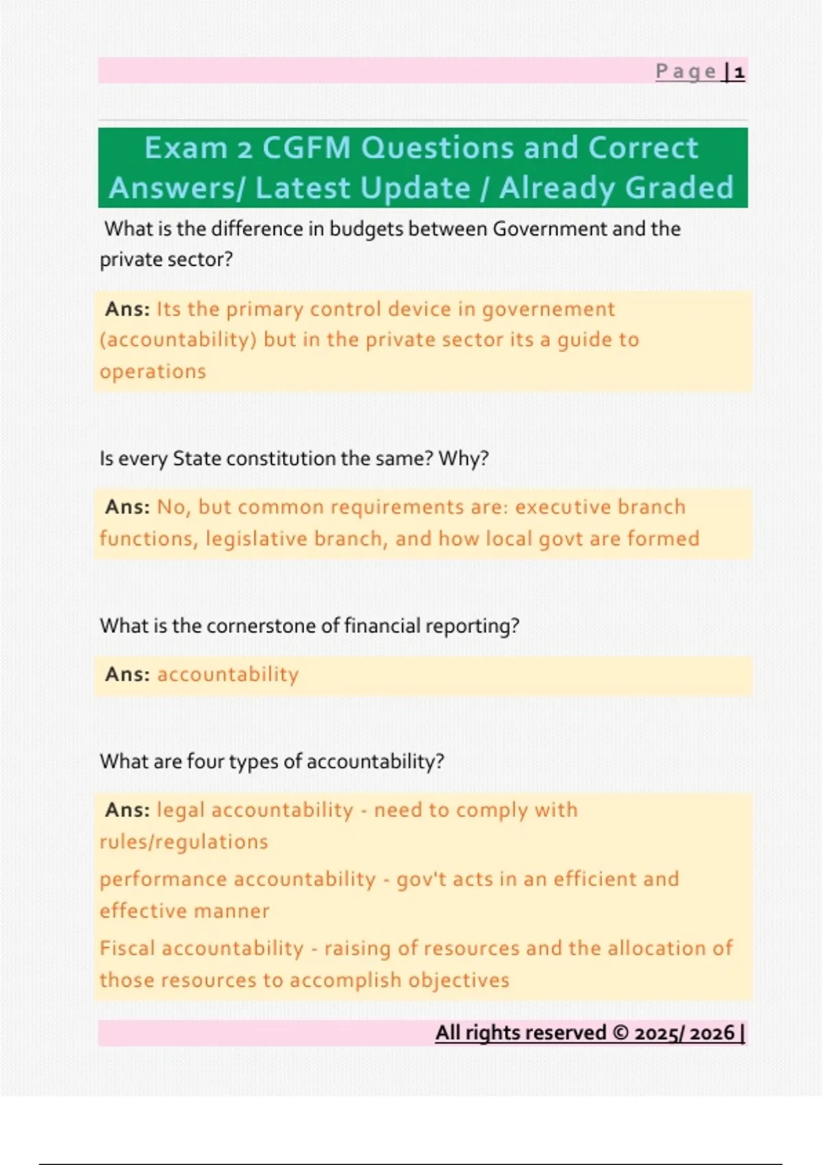 What is the difference in budgets between Government and the private sector? Ans: Its the primary control device in governement (accountability) but in the private sector its a guide to operations Is every State constitution the same? Why? Ans: No, but common requirements are: executive branch functions, legislative branch, and how local govt are formed What is the cornerstone of financial reporting? Ans: accountability What are four types of accountability? Ans: legal accountability - need to comply with rules/regulations performance accountability - gov't acts in an efficient and effective manner Fiscal accountability - raising of resources and the allocation of those resources to accomplish objectives Page | 2 operational accountability - stewardship of public resources What is interperiod or intergenerational equity? Ans: paying current-years services to future-year taxpayers What is one way the federal gov't tries to balance a budget? Ans: debt ceiling (public debt that can be outstanding) What are the common users of governmental financial reports? Ans: legislators, other oversight org's, citizens, investors, creditors, media, financial mangers and program managers What is an example of intergovernmental revenues? Ans: grants What are the two types of government financial reports? Ans: point-in-time (aka stock reports) - current info as of the date of the report (example: balance sheet) period report (aka flow reports) - covers the entire fiscal year All rights reserved © 2025/ 2026 | Page | 3 All rights reserved © 2025/ 2026 | What do the general purpose external financial reports (GPEFR) consist of? Ans: audited financial statements, notes, required supplemental info. Other accompanying info isn't required but can be include