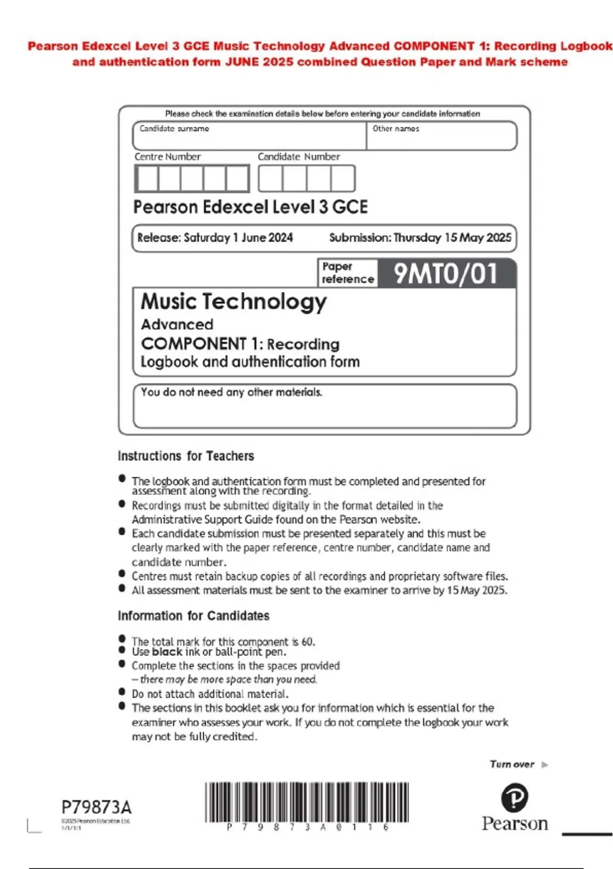 Pearson Edexcel Level 3 GCE Music Technology Advanced COMPONENT 1: Recording Logbook and authentication form JUNE 2025 combined Question Paper and Mark scheme