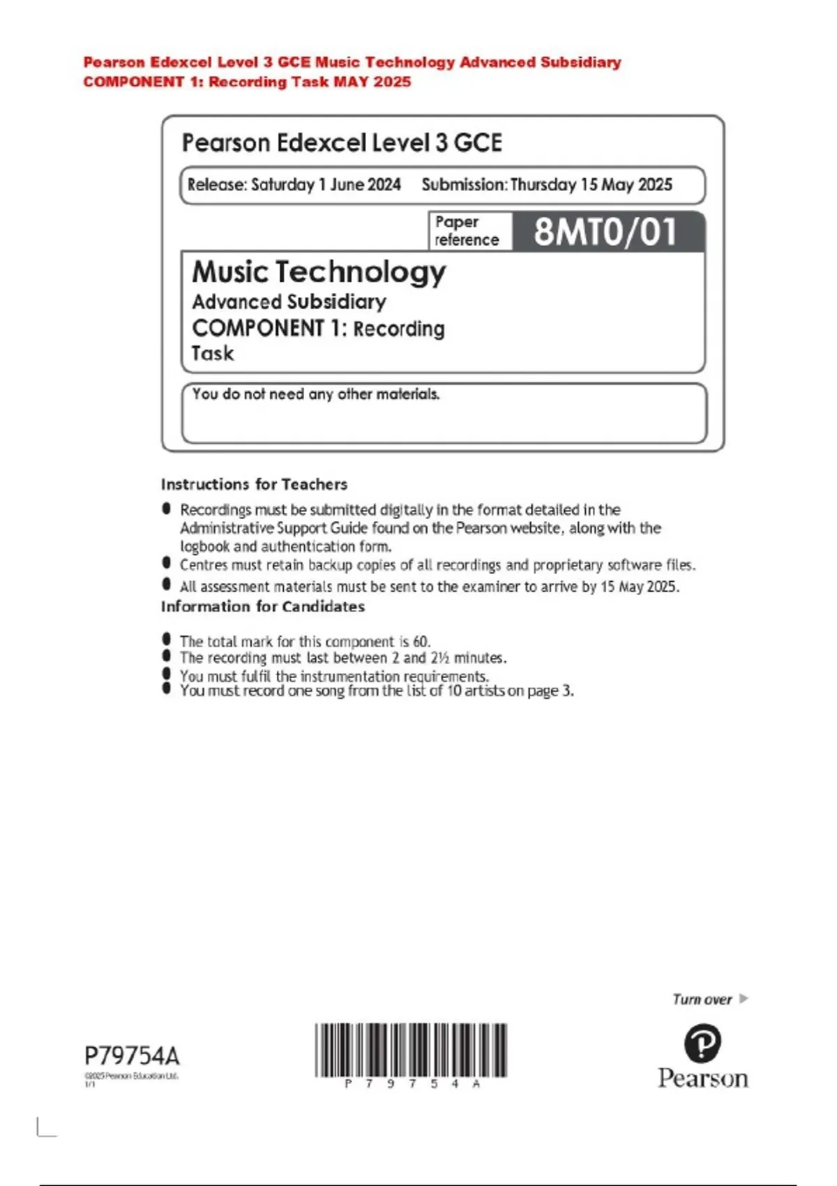 Pearson Edexcel Level 3 GCE Music Technology Advanced Subsidiary COMPONENT 1: Recording Task MAY 2025