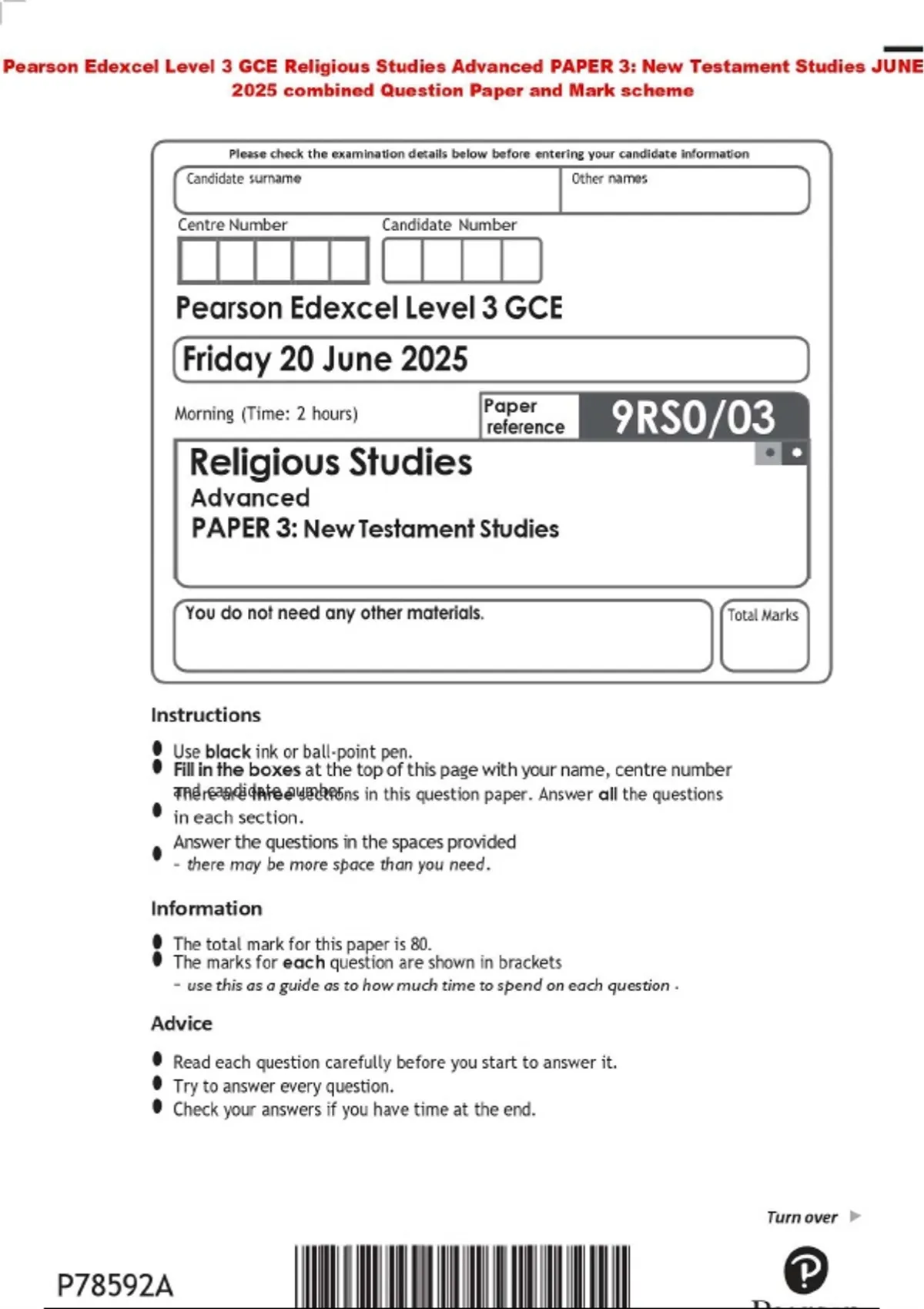 Pearson Edexcel Level 3 GCE Religious Studies Advanced PAPER 3: New Testament Studies JUNE 2025 combined Question Paper and Mark scheme