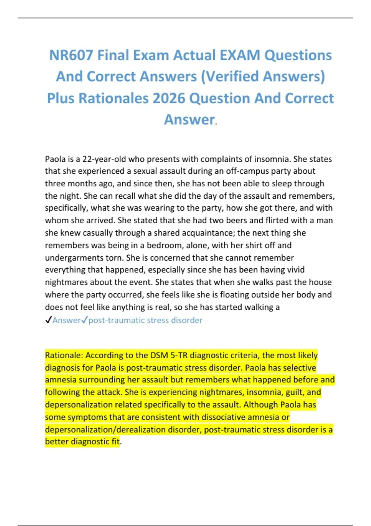 ✔️Answer✔️post-traumatic stress disorder