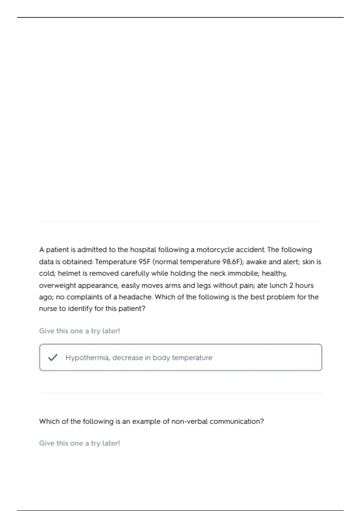 data is obtained: Temperature 95F (normal temperature 98.6F); awake and alert; skin is