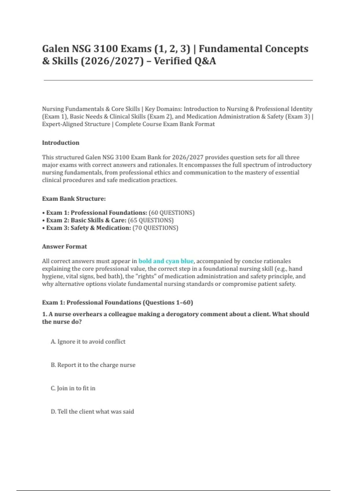 This structured Galen NSG 3100 Exam Bank for 2026/2027 provides question sets for all three